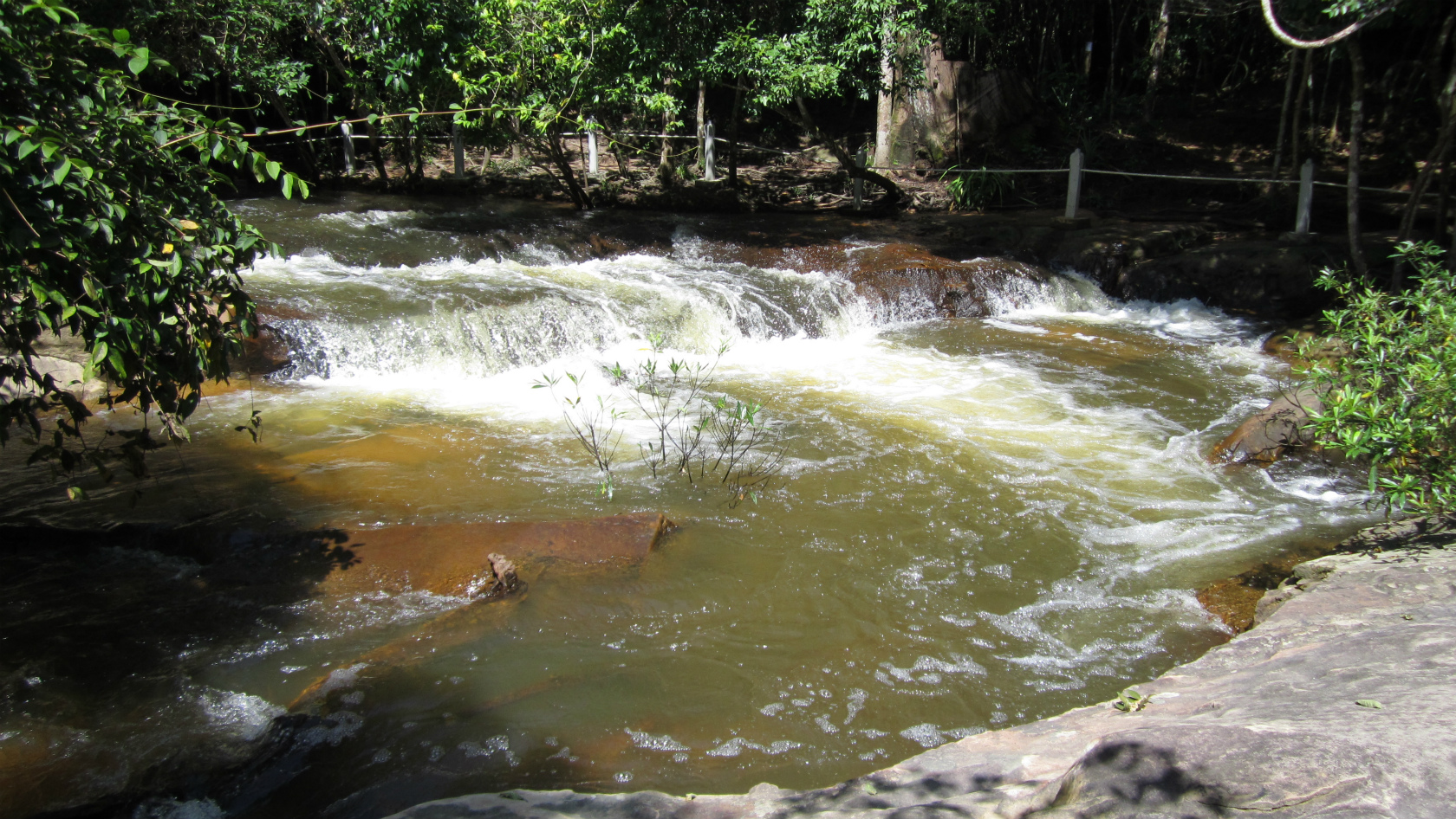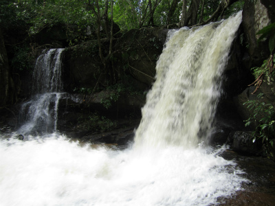 クバール・スピアン道中は、山岳道路であるが舗装路でありトゥクトゥクでも気楽に行ける道程だ。 しかし、 入口ゲートからは川沿いの土道を登る行程になる。ここからが結構辛い。 大人の足でも30分はかかる、文字通りの山道だ。川は、山頂からシェムリアップ川に繋がる 清流で、渓谷を形成し段差では滝も有している。 クバール・スピアンとは「川の源流」という意味だ。 |