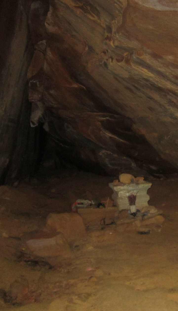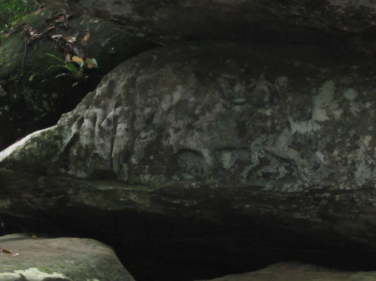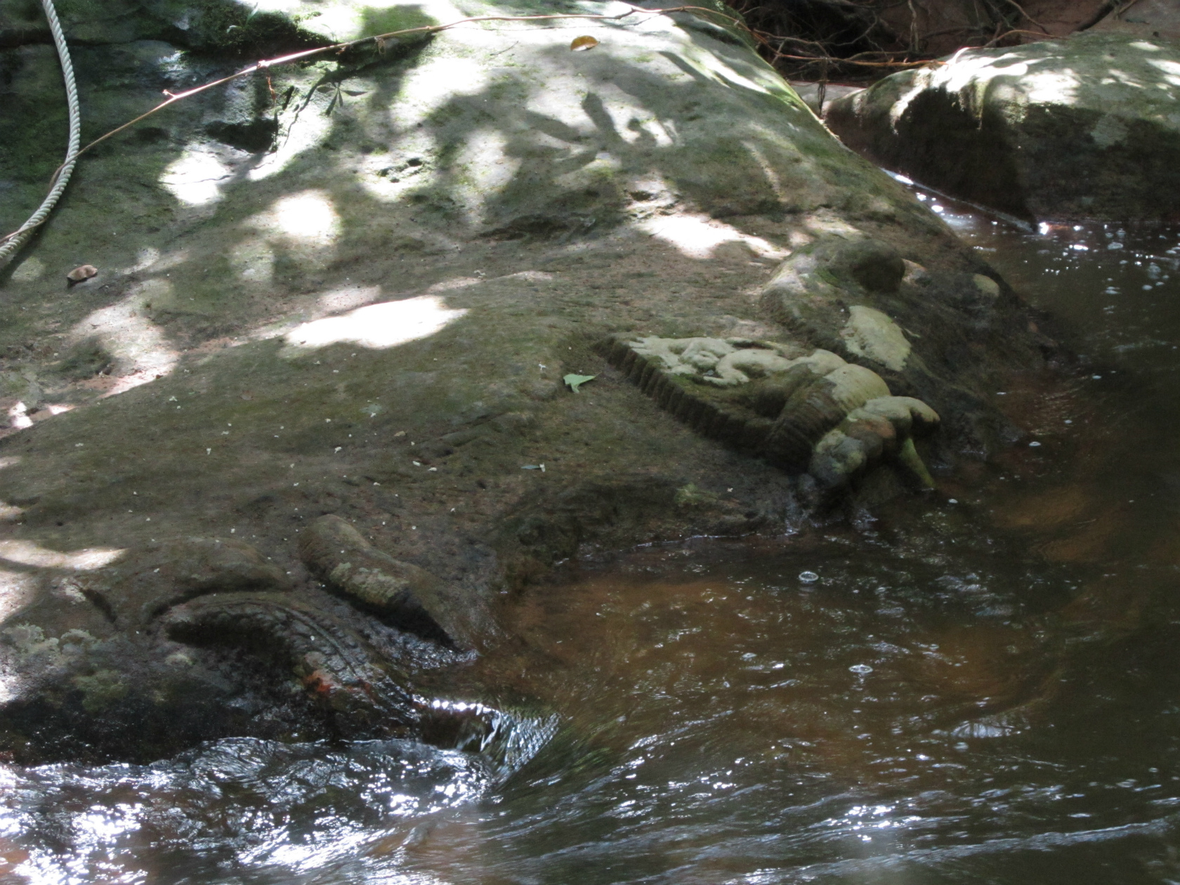 ここは建物よりも磨崖仏として有名だ。その彫刻が見られる場所とは、 切立った岩崖であったり、 川の中であったり、対岸の屏風岩であったりする。従って、『季節的な見学制約』を もろに受ける史跡になる。私の行った10月は雨季に属し、増水した雨水で 川中に連なるように彫刻された壁面画が 水没して見えない事が多かった。また、水質として 泥で濁りきり、目視を不可能にさせていた箇所もあった。 |