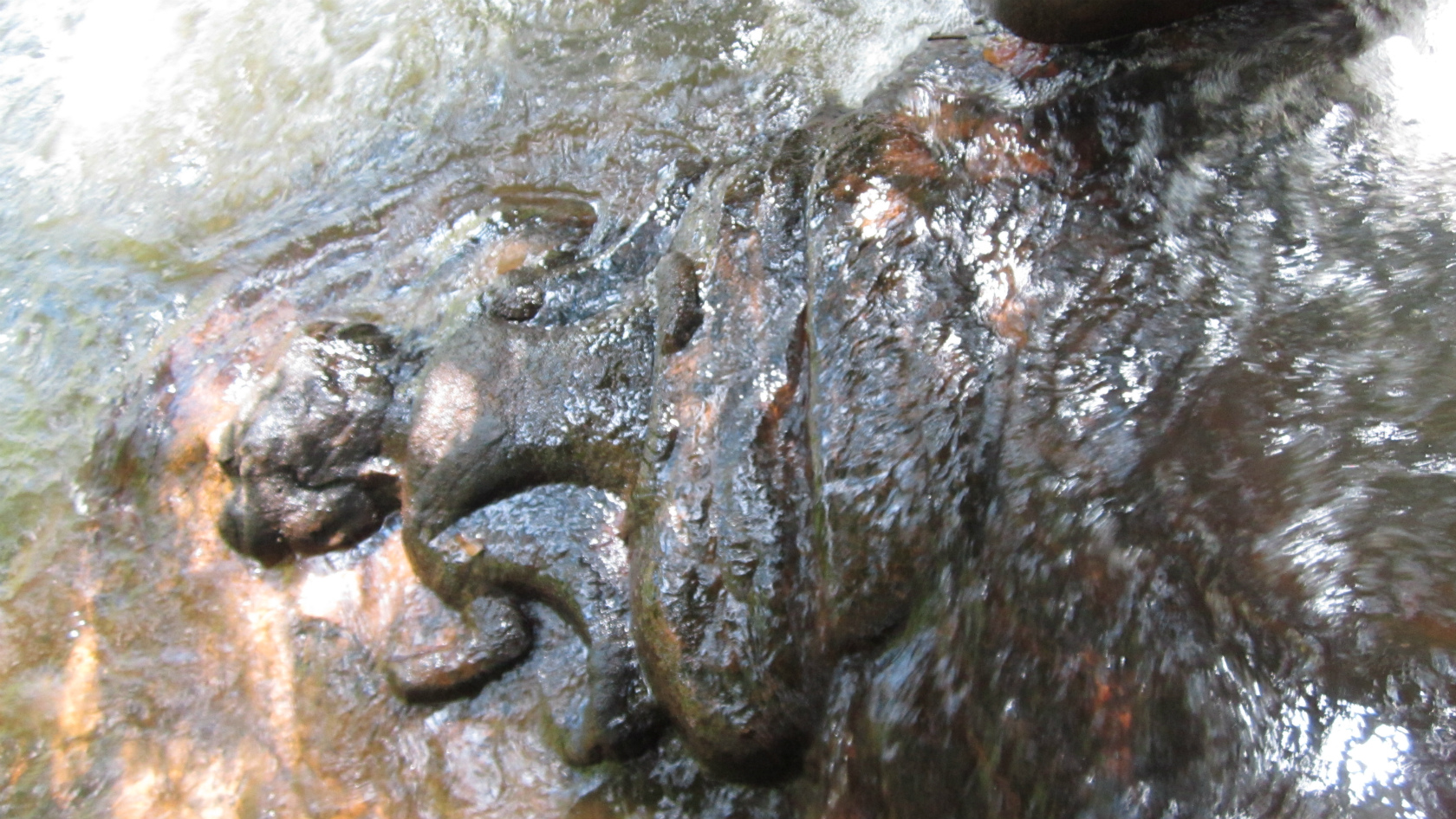 男の説明は続く。滝のたもと、円形石に形成された凹凸縁を指でなぞる。 『カエルじゃ』 「あっ、これはオレでも判るっす」 『フォッフォッフォ』 さらに身を反転させるジェスチャーで、後の巨岩の斜面を刮目するように促す。 『振り返るんじゃ!後の岩にはワニと、翁もおるぞい』 「スゲー、知らないで帰るところだったわ!」 『フォッフォッフォ』 |