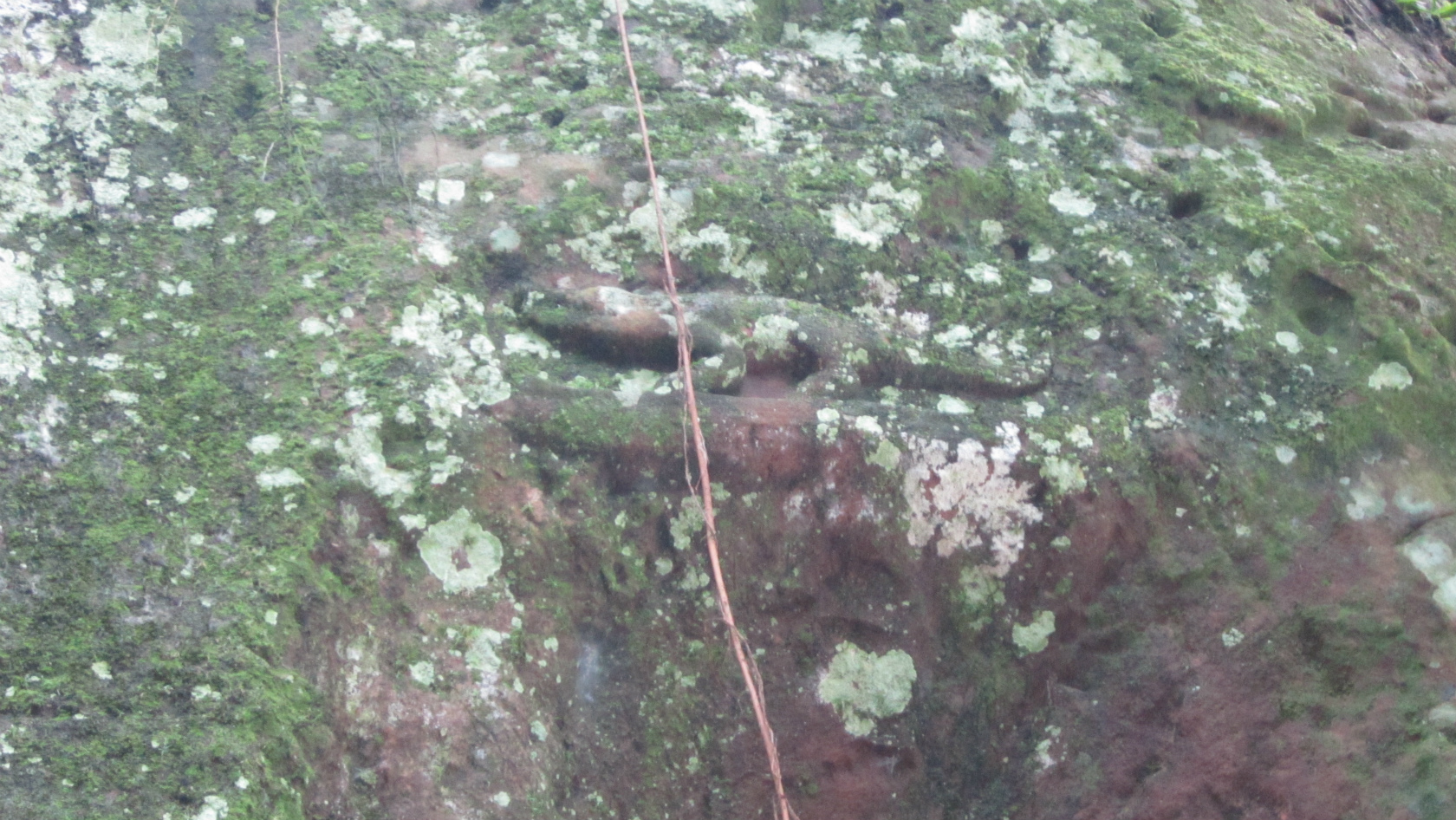 滝の脇に木橋が整備されて おり、降りて真近まで行く事が可能だ。連れて行ってもらった先で、二人でしゃがんで滝壺 を観察した。水量はやはり多いのだろう。轟音と共に 水しぶきが霧状に蒸散し、周囲の温度を下げているのがわかる。 涼しいなぁ〜、と胡坐をかいて悦に入って ると、ガイドがムクリと立ち上がった。どうやら、最後の見学場所に連れて行くらしい。 『仕上げじゃ、ついて来るんじゃ』 そう言って、川岸を離れ反対の山中に引導を始めた。切立つ岩の間を抜け、ゴツゴツとした 岩に足をかけ斜面を登った。再び、汗が噴出するのがわかった。 「爺さん、どこまで連れていくんだ?」 『ここじゃ』 立ち止まった爺は、茂みの一角にある一枚岩を指して言った。 『ヨニ台じゃ、後にあるリリーフも見逃してはならぬぞ』 |