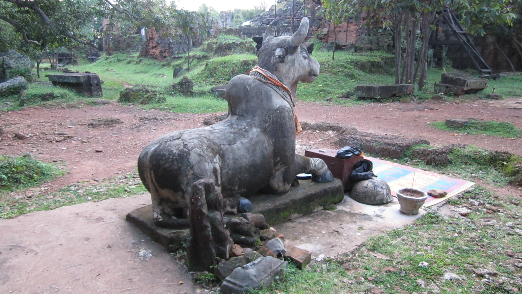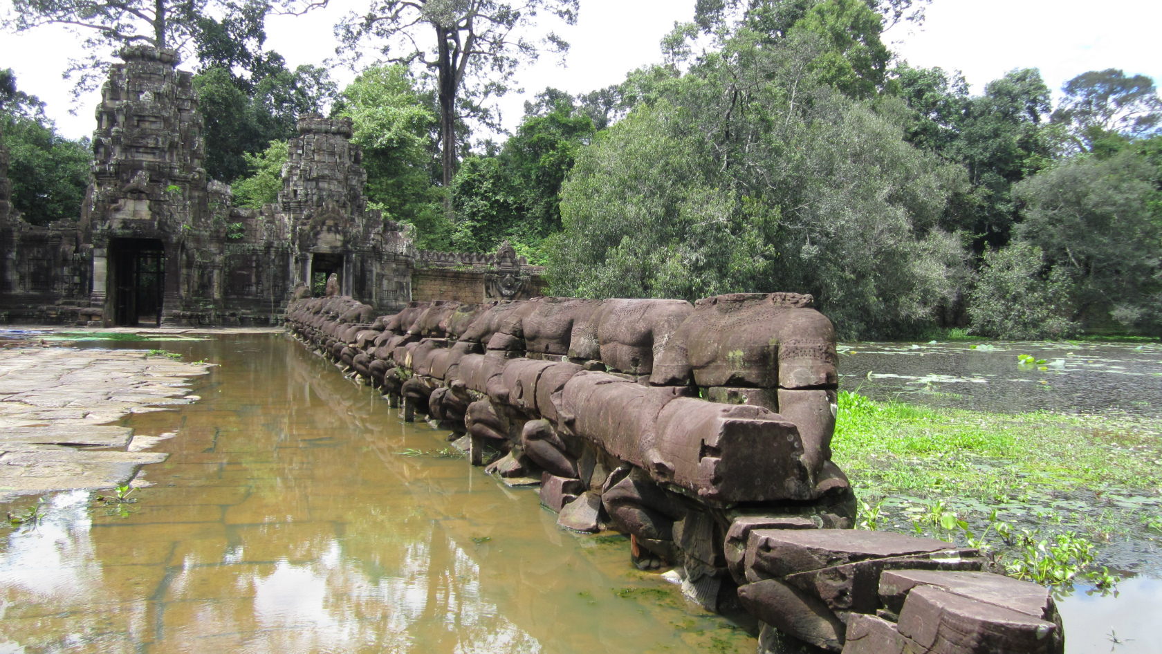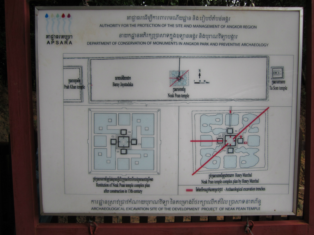 ニャック・ポアンとは、「絡み合う蛇」という意味だ。水引きしている 池の配置は(卍)になっており、配置構造そのものが名前を体現している。また、 中央基壇に2匹の蛇が絡み合うオブジェがあり、これが名前の由来になっているようだ。 4つの池にある像のモチーフは (ゾウ)(人間)(ライオン)(牛の頭)を形どっている。 |