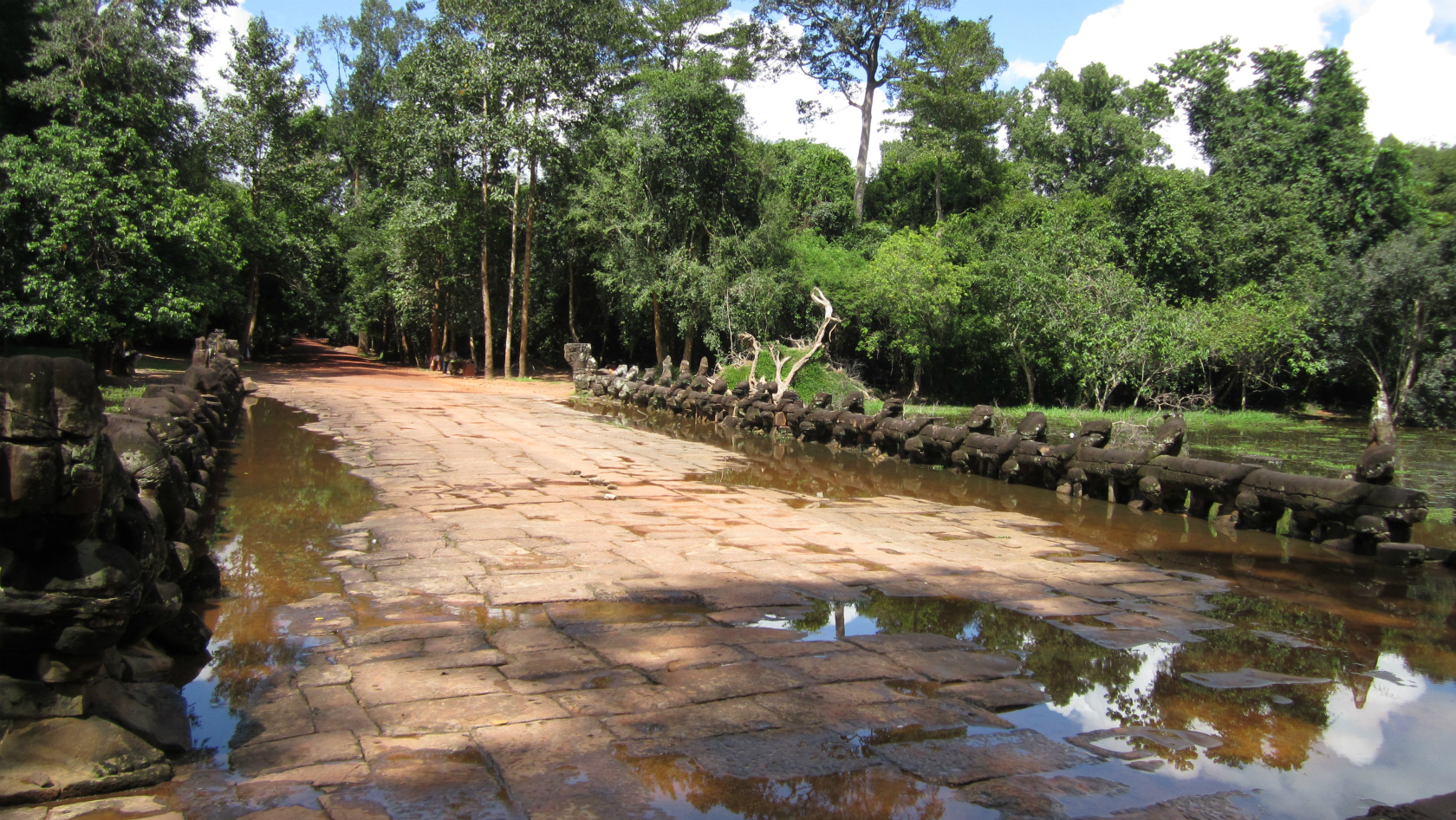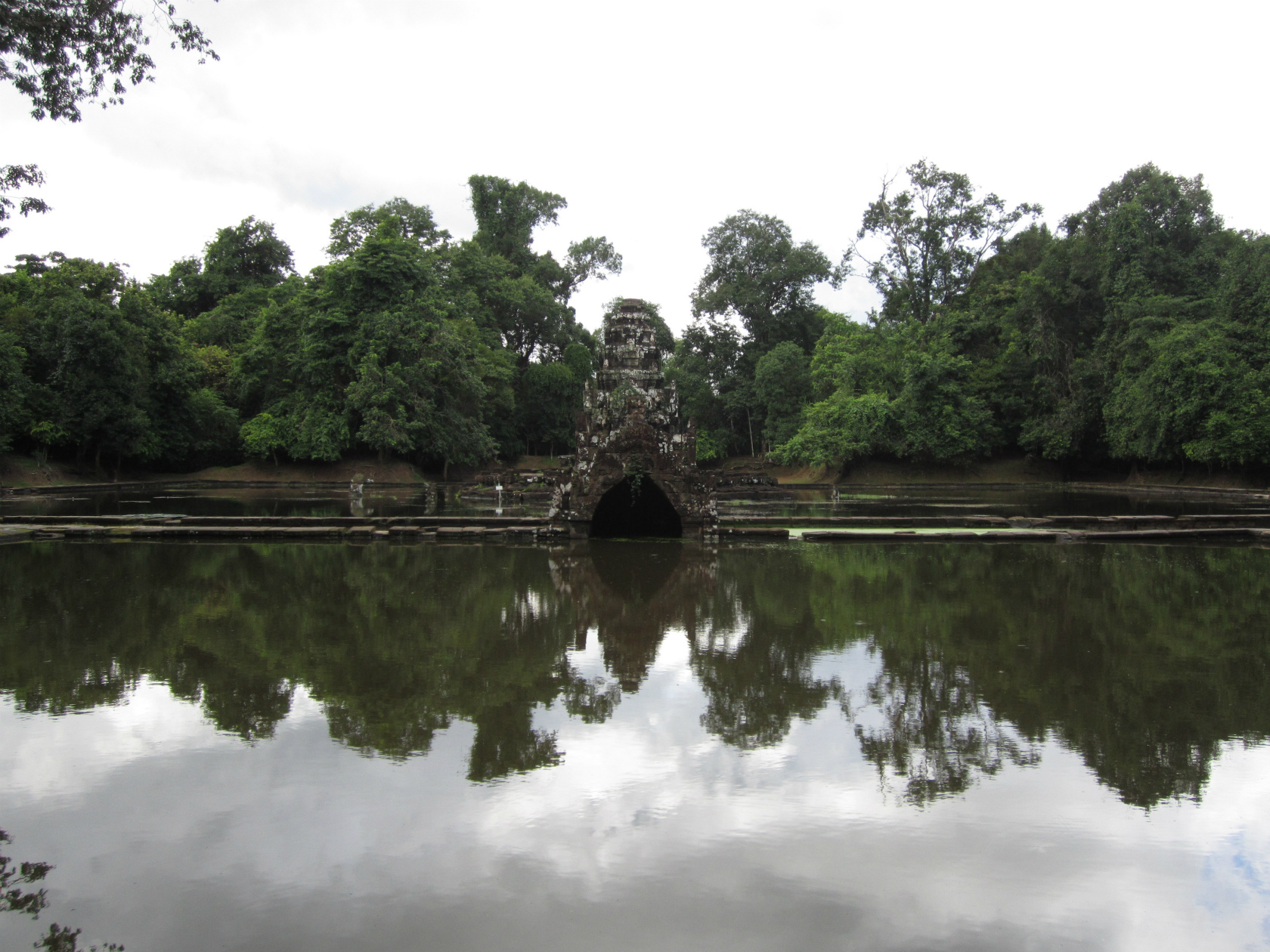 ニャック・ポアンニャック・ポアンは70×70m四方の大池に、東西南北に向け正確に 4つの小池を有している。其々に動物を模した石像で飾りつけられ、 中央池に向けて噴水を流し込む仕組みなっていた。完成当時は、 ちょうど庭園を思わせる外観だったに違いない。 正確な方位の 配置と、削ぎ落とす部分さえ見つからない、対称性を有する幾何学的様式美は 、この遺跡こそが真骨頂であると云っていいだろう。 |