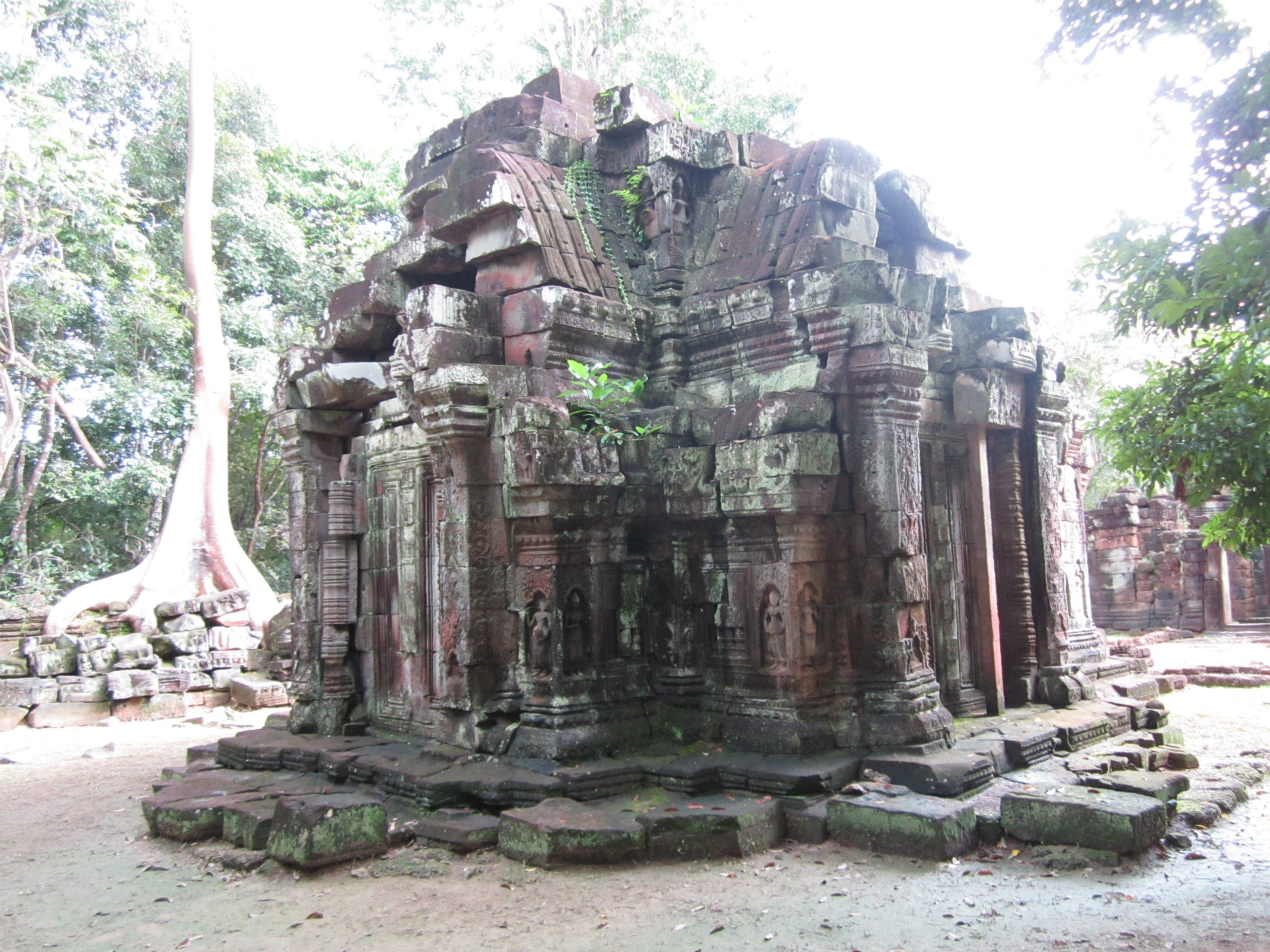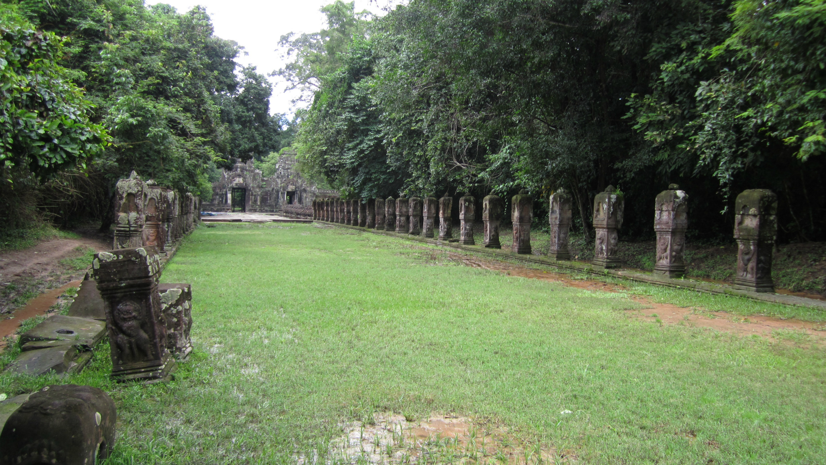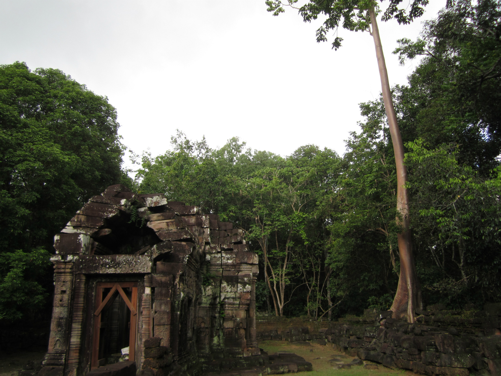 プリア・カンとは「聖なる剣」という意味だ。 敷地の構成は十字の構造で、東西南北に其々門を構える。1191年に 創建された祖寺方寺院である。 ジャヤヴァルマン七世の即位10年を記念し、父親の菩提を弔うために建てられた 経緯で、その用途は寺院というよりも、多数の職業や階級の人間が 集うテーマパーク的な意味合いがあった。 珍しい建物をあげれば、北側に ある2階建の開放性祠堂だろう。2階部に登ることは出来ないが、対側の土手から 全体像を眺めることはできる。この2階建石積建造物は プリア・カンにしかない建物なのだという。 |