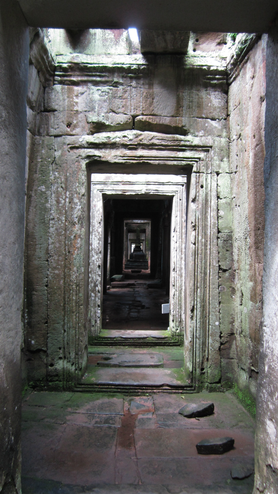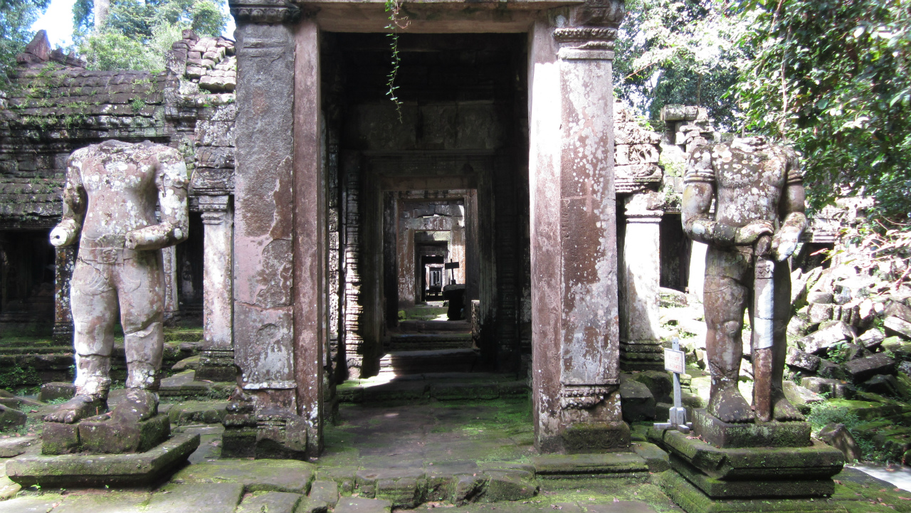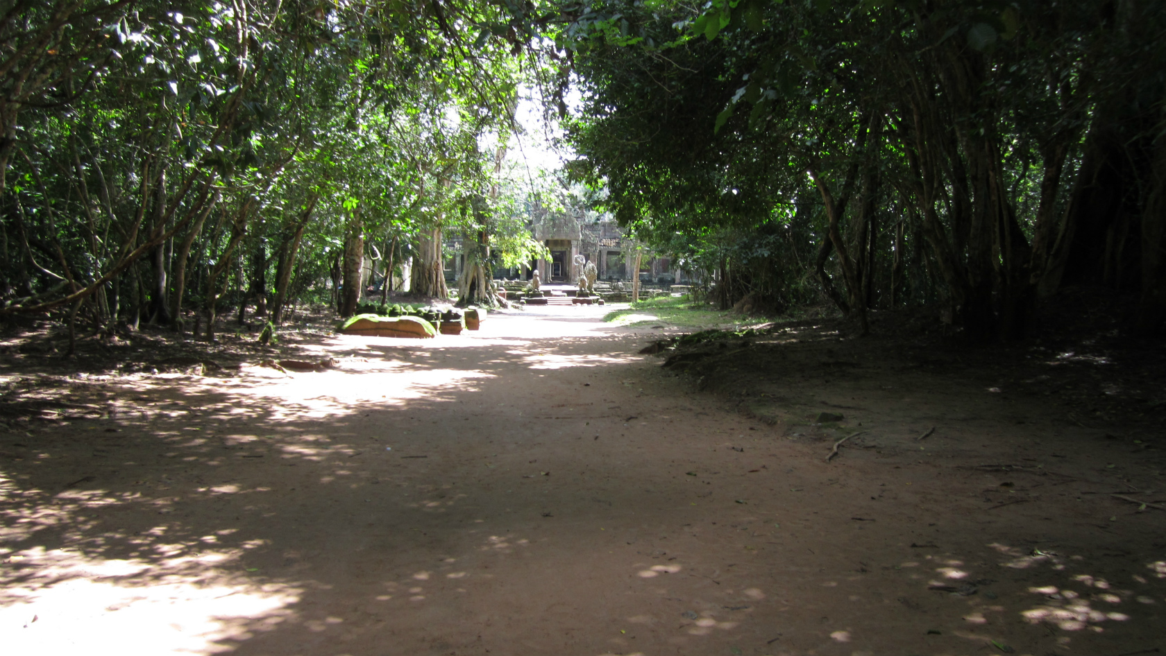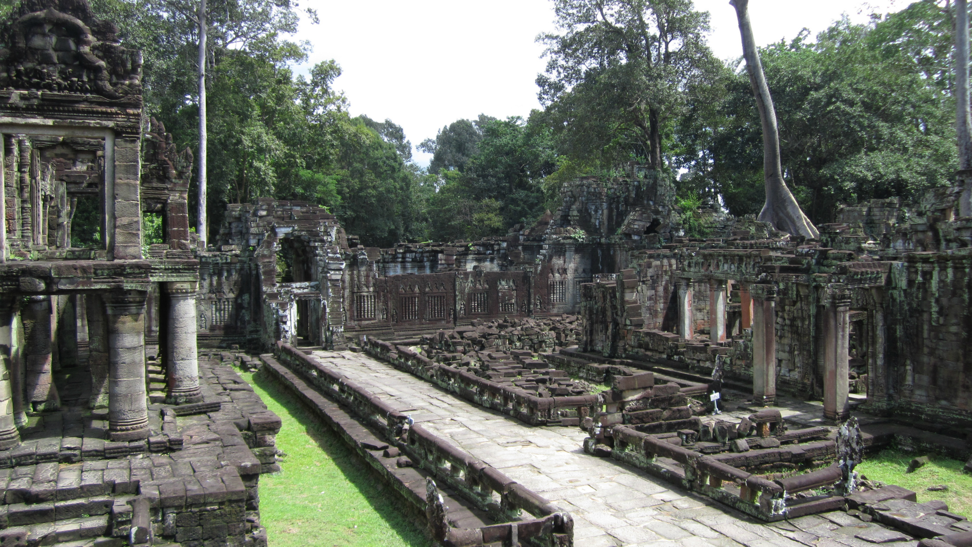 プリア・カンとは「聖なる剣」という意味だ。 敷地の構成は十字の構造で、東西南北に其々門を構える。1191年に 創建された祖寺方寺院である。 ジャヤヴァルマン七世の即位10年を記念し、父親の菩提を弔うために建てられた 経緯で、その用途は寺院というよりも、多数の職業や階級の人間が 集うテーマパーク的な意味合いがあった。 珍しい建物をあげれば、北側に ある2階建の開放性祠堂だろう。2階部に登ることは出来ないが、対側の土手から 全体像を眺めることはできる。この2階建石積建造物は プリア・カンにしかない建物なのだという。 |