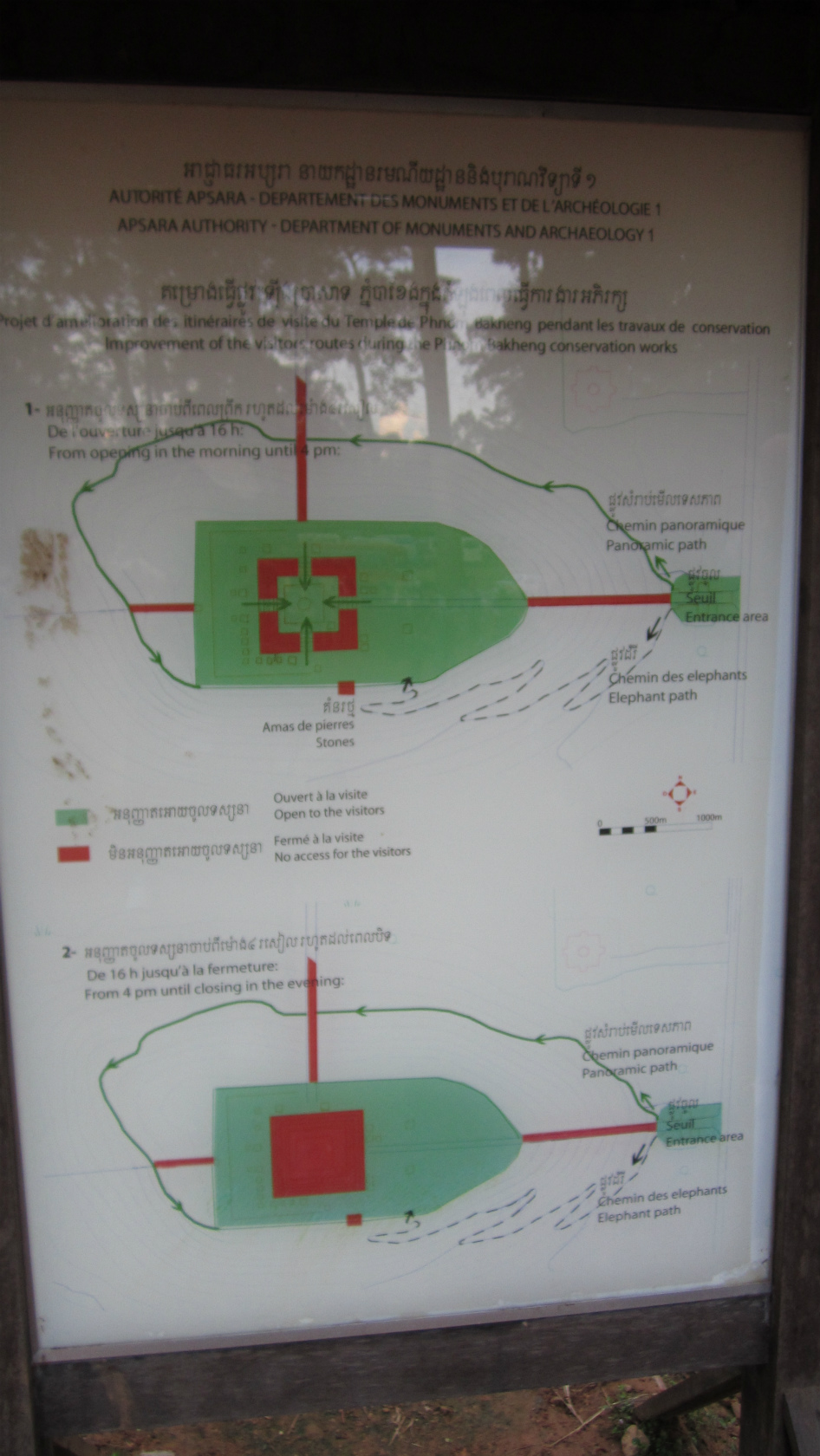プノン・バケンは丘そのものが、都城であった。 平地に巨大な城郭を築く前の時代、9世紀末ころ、 ヤショヴァルマン1世によって山頂に 祠堂が築され、現在は無いが、丘の回りには環濠が掘られ、 中央祠堂から東西南北にラテライトの参道階段が延びていたという。 総合的な山岳都城であった。 丘そのものを 須弥山として模している。 結局、平地にある数少ない丘の特異性と自然崇拝的な地理上の立地から、のちの時代もプノン・バケン 丘を中心として 直ぐ近くに アンコールトム、アンコールワットが建設されている。このことから、根本的に 長き間、クメール人にとって当丘が聖地として見做されてきた歴史があるのだろう。 |