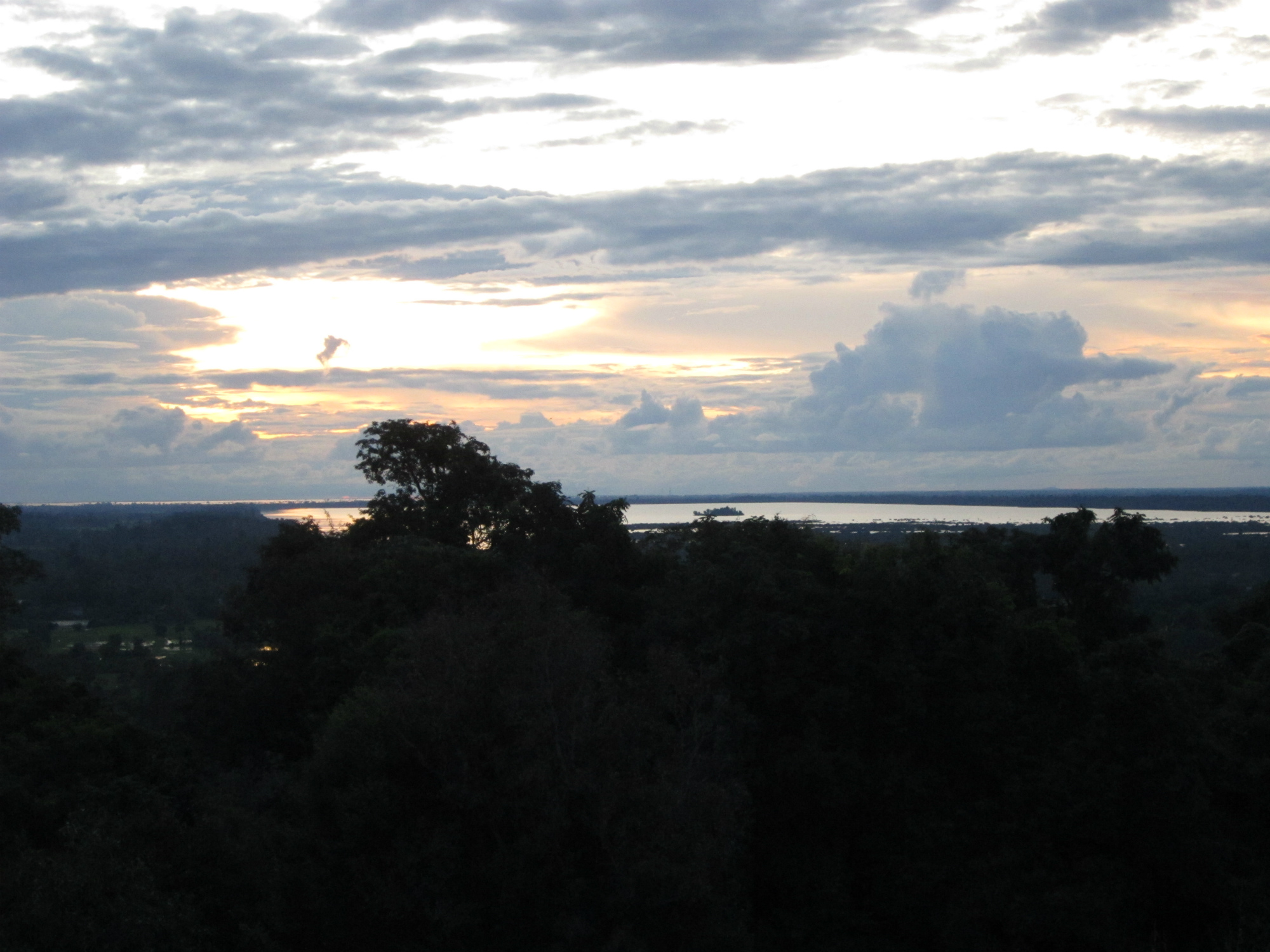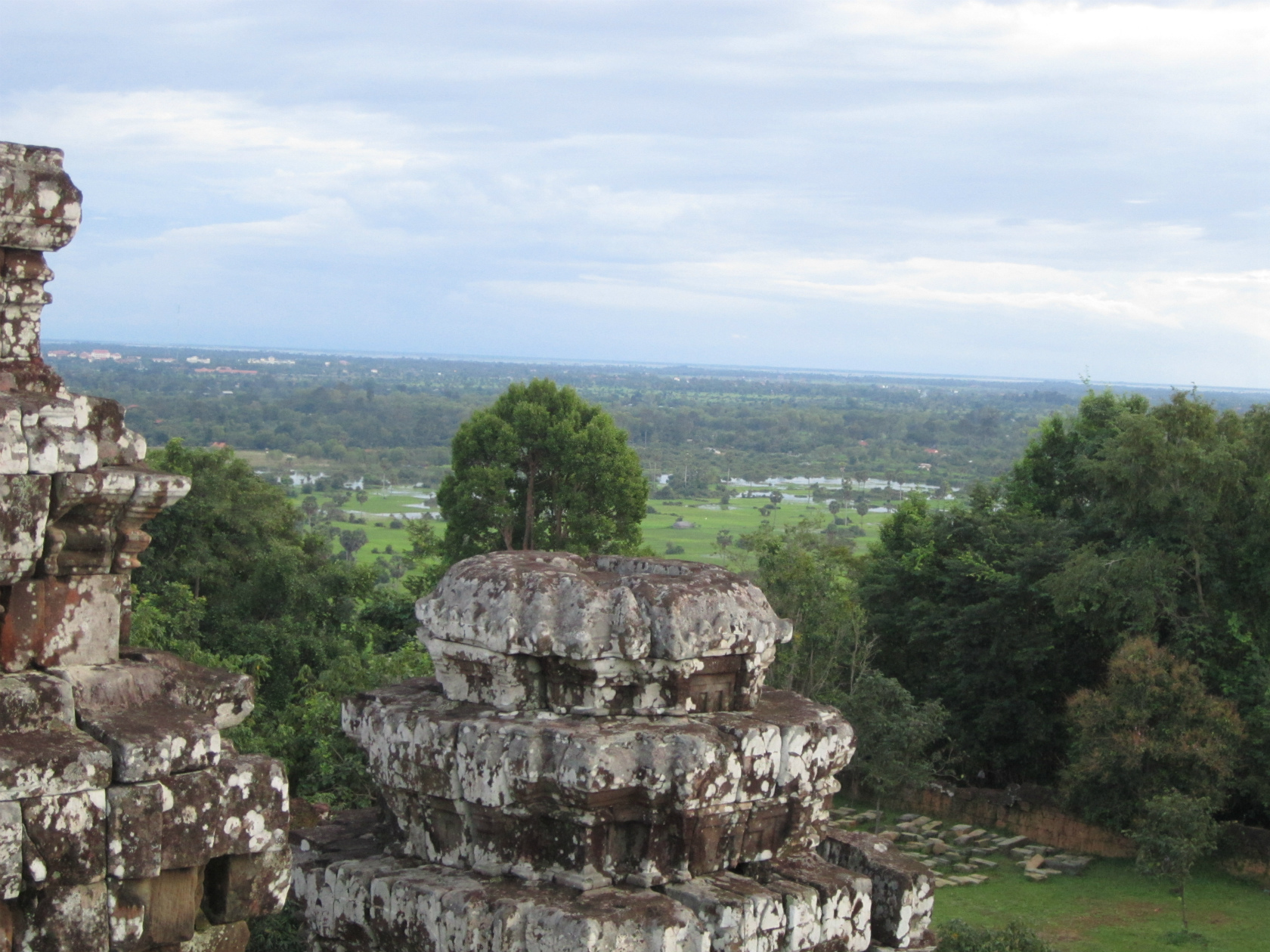 シェムリアップ地方に広がる平原は 東京23区くらいの広さで、遮る物の無い見渡す平原に、山や丘があればかなり目立つ。 古今東西、それは 山岳信仰の対象に成り得る存在であり、この地方では、 アンコール3聖山と数えられている。 プノン・クロム プノン・ボック そして3つ目が、このプノン・バケンだ。標高は60mあり、頂上に祠堂がある。 目下の平原は近代施設や道路など一切が無いので、360度パノラマ状で 深緑色のジャングルを見下ろせる。 景色は格別だ。 |
