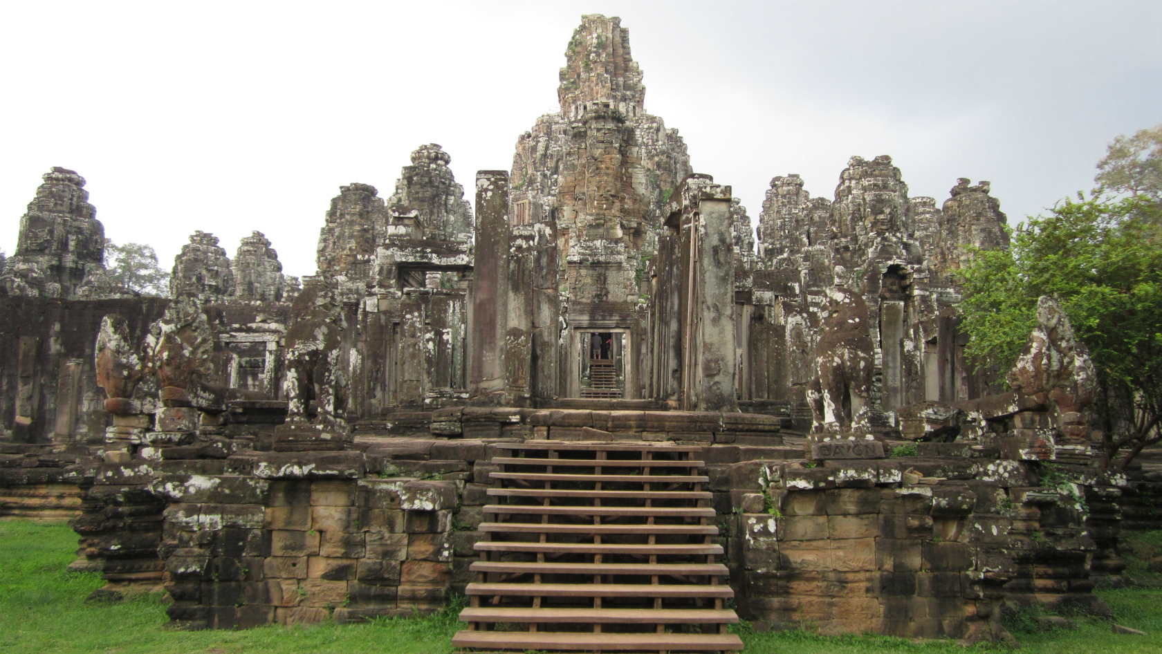 バイヨン最外周の第一回廊(140×160m)があり、その上段に第二回廊 (70×80m)が、もう1周している構造である。16本の尖塔を有し、その 最中央部に高経43mの中心祠堂がある。表面を覆うように50面の大小様々な観音菩薩が造られ、 その1つ1つに微妙な表情の差異を出し、1つとして同じ笑みが無いという。 |