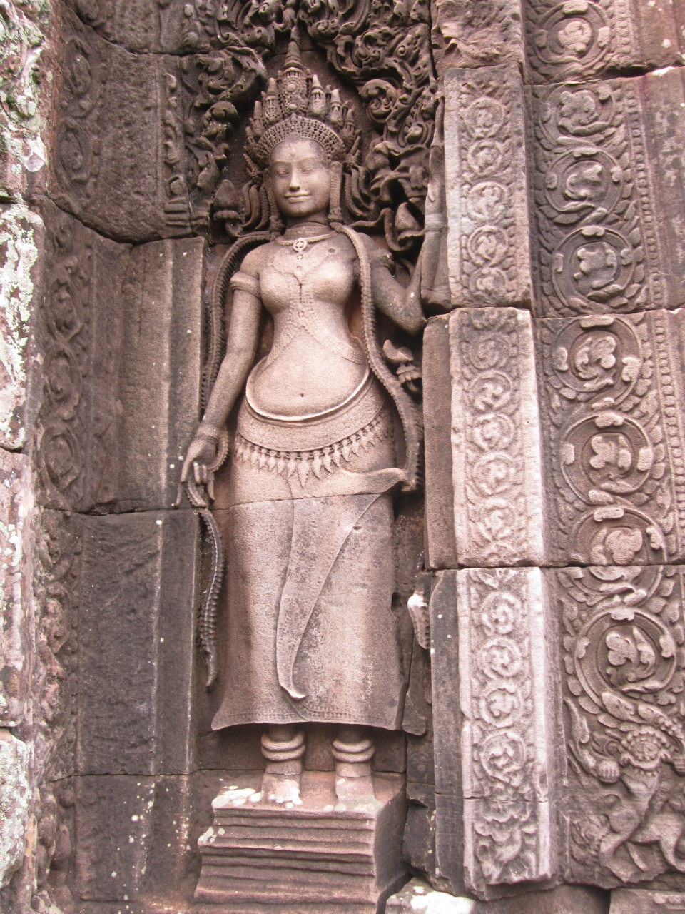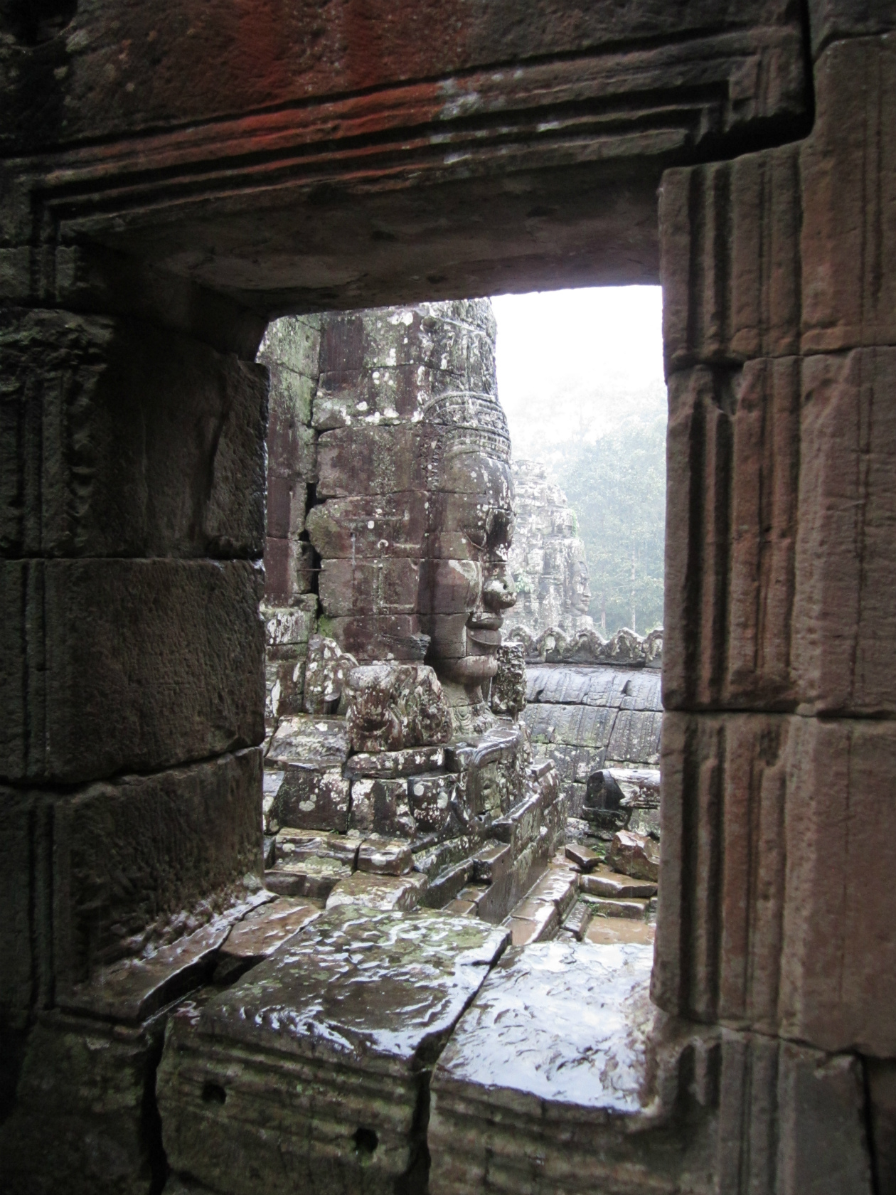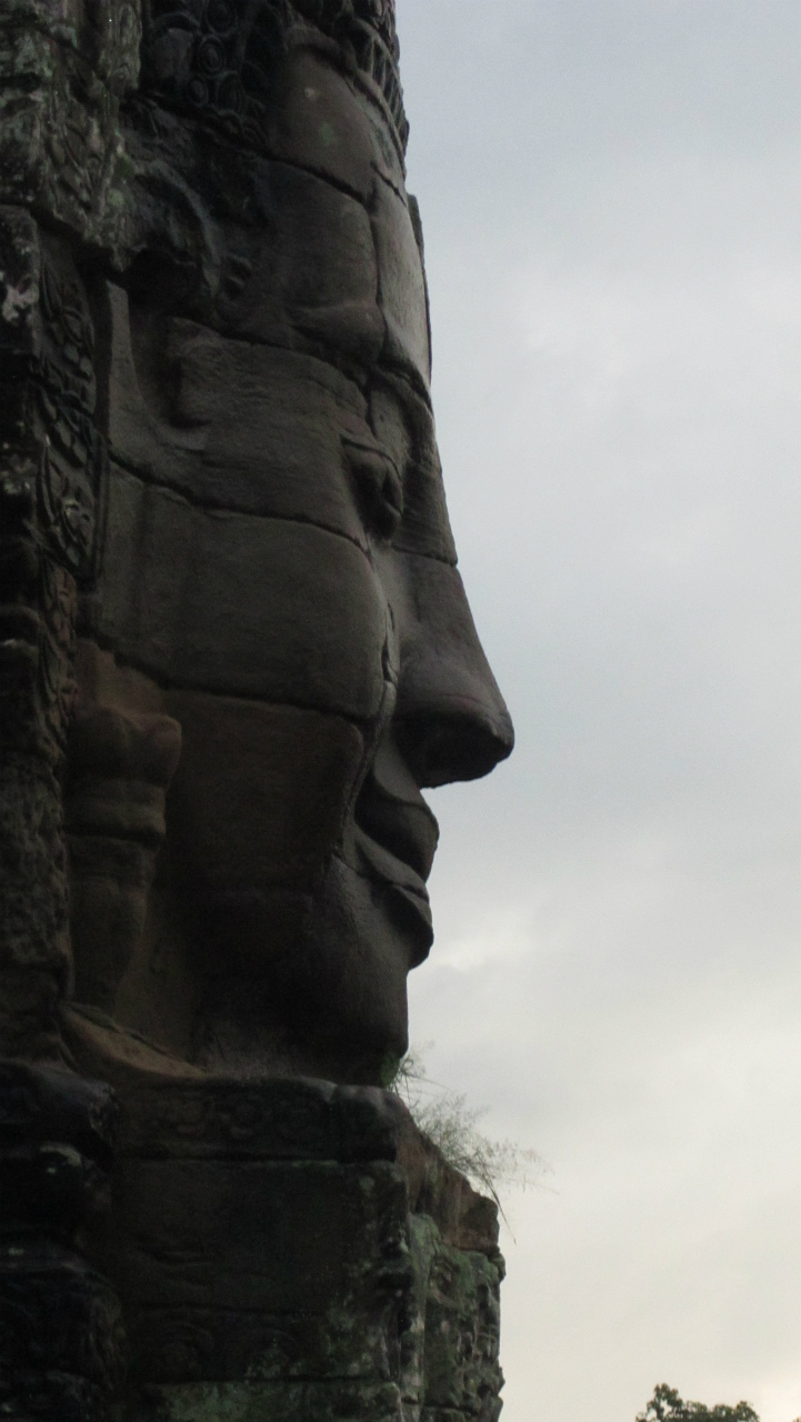 ワットに比べ遺跡の損傷が大きく、四面仏の崩壊が目立つ。 綺麗に顔面がフル残存している人面は、観光客にとって絶好の写真撮影ポイントで、 チョッとした人だまりが形成されている。木製の柵越しの1塔がそれだ。 カンボジアの紙幣、200Rのデザインにもなっている個体だ。 撮影の時は、 人面石と向き合って顔と顔を合わせてKissする様に、 1枚写真として収めるのが粋な撮り方だそうだ。 |