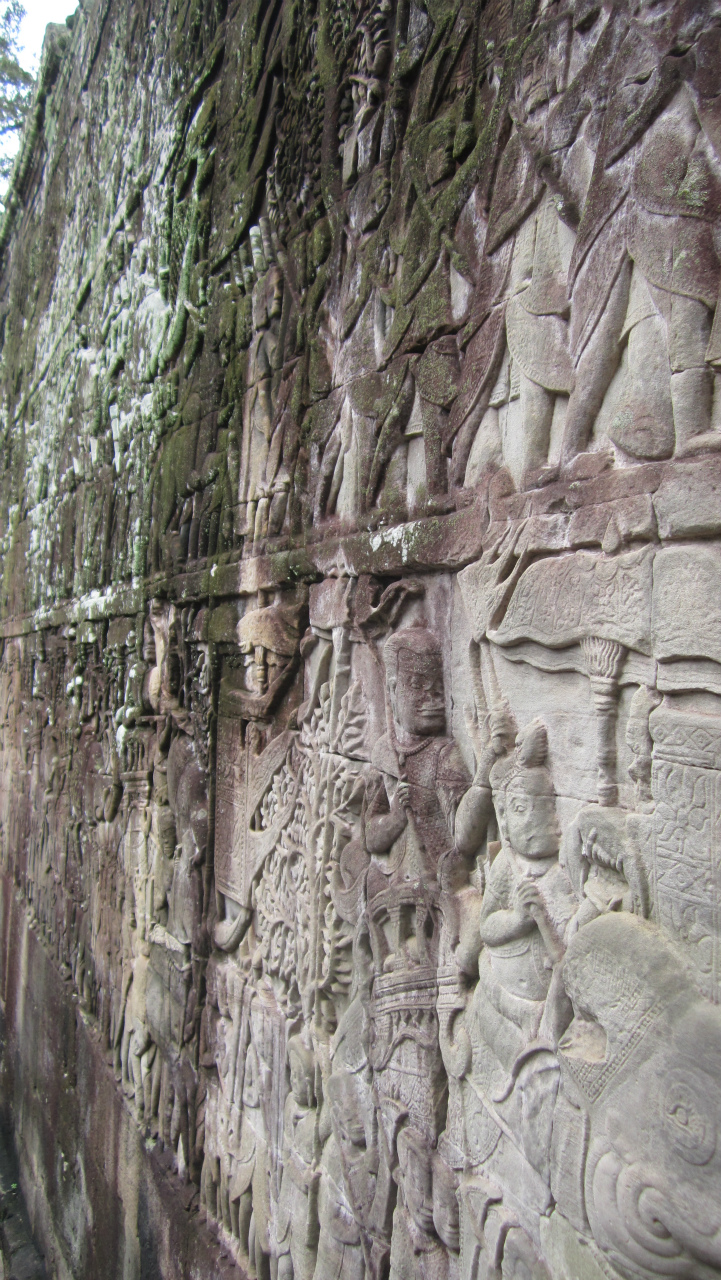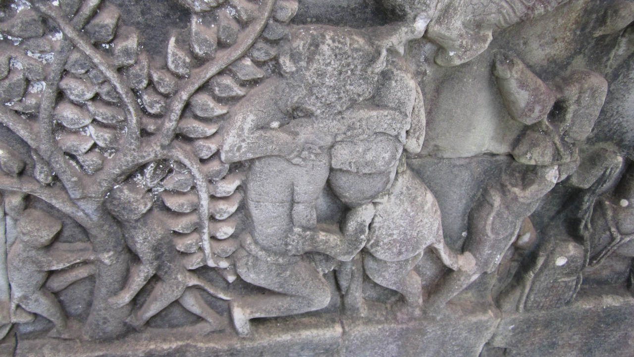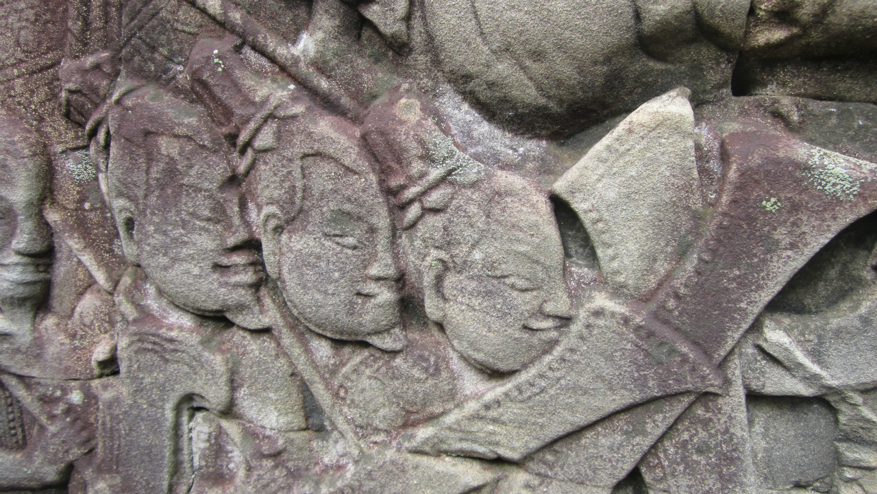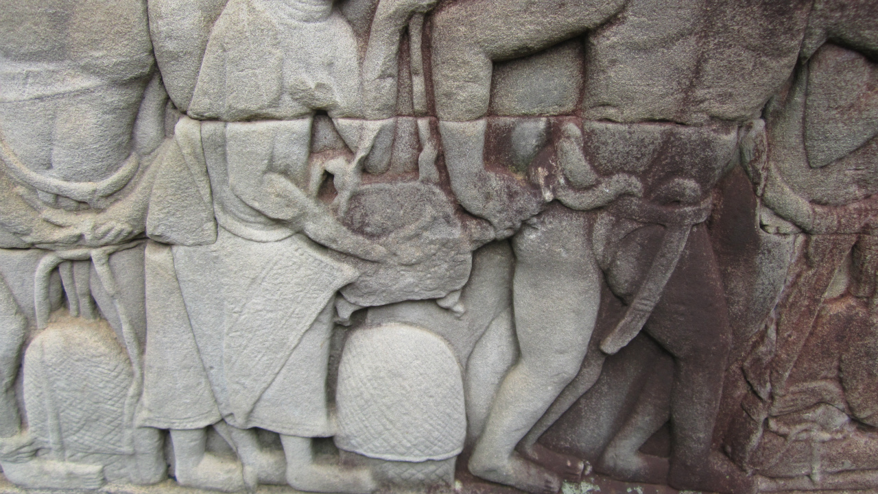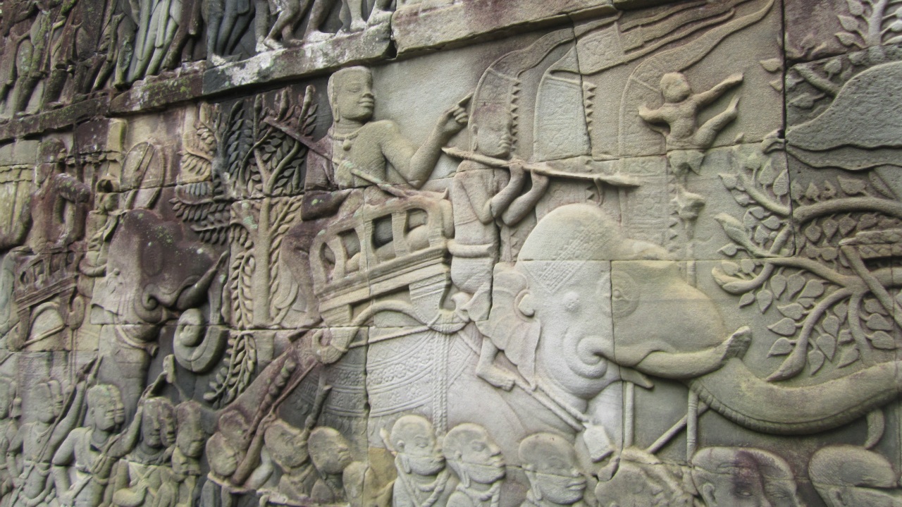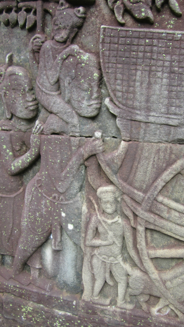 第一回廊宗教的な色合いが濃いワットの回廊リリーフに比べ、アンコールトム の壁面彫刻は住民の暮らしや愛憎劇が生々しく描写されている。そんな 絵巻を再現しているのが、第一回廊である。上中下の三段に及ぶ大壁彫刻だ。 主にチャンパ軍との 闘いに遠征している時に様子を彫り込んだものが多い。 土着のクメール人に追従しているのが中国人兵である 。左がクメール人で右が中国人。描写に明らかな違いをもたせているのが面白い。 |