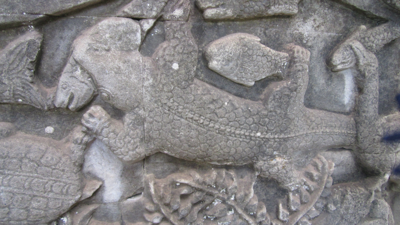 その他の特徴として、リリーフの彫り具合が 非常に深く立体感がある。入口の柱を通すまぐさ石も綺麗だ。 デザインは「カーラ」という時間を支配する古代インドの神である。 |
