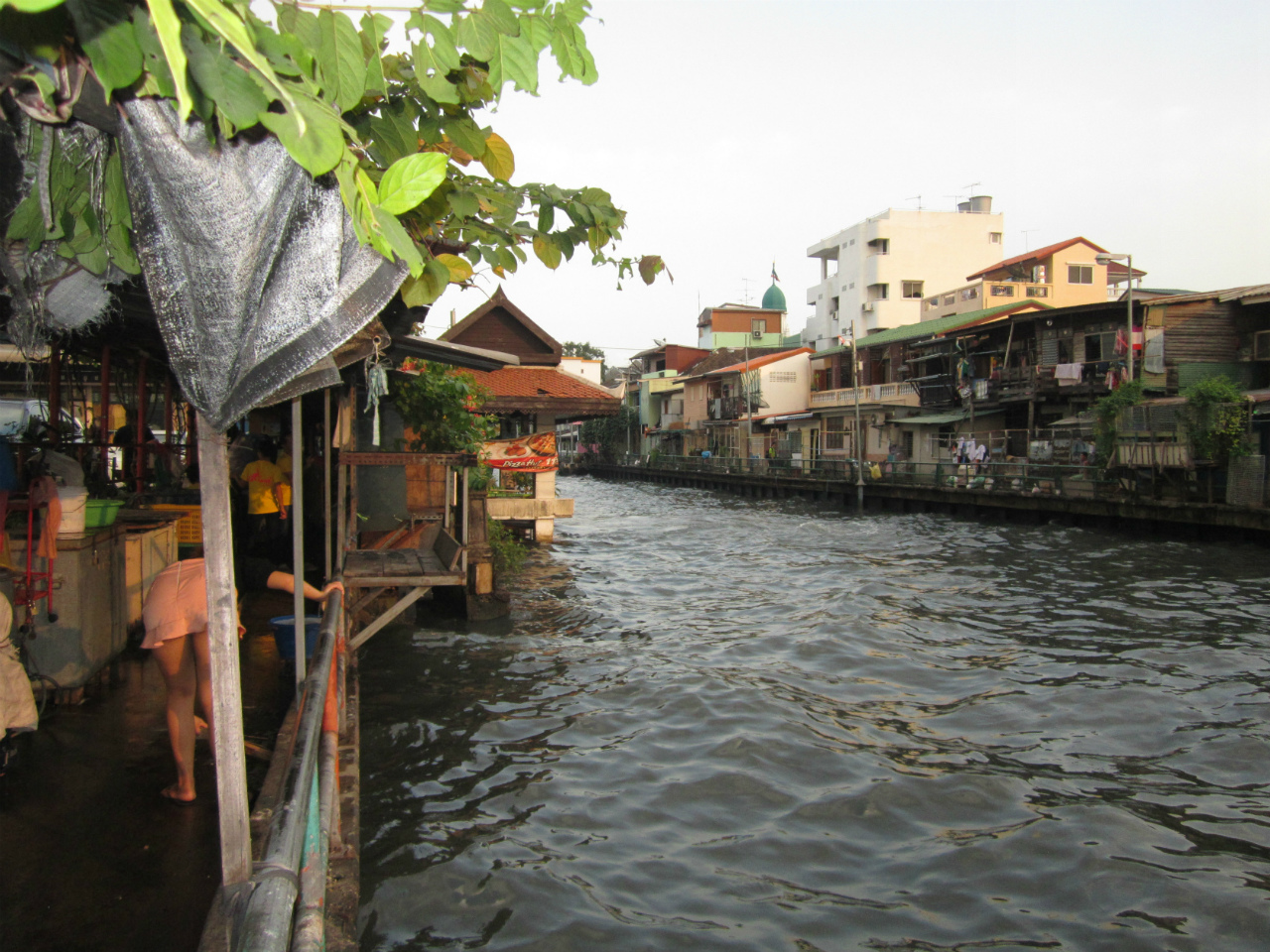 私の場合、 ホテルを南に進路を取れば駅口に、北に向かえばセーンセープ運河のNana Nuaと呼ばれる 船着場に辿り着く立地だった。Nana Nuaから運河沿いにジェットボートが出ていて、東に向かい王宮の直ぐ脇まで ジェットボートで繋いていたのだった。 各船着場も人の往来が期待できるためか、駅に劣らず盛り場になっていて屋台や市場が出ていることが多い。 旅行者用の高層ホテルが船着場の脇に建ってることもある。 ボートの乗り方は簡単だ。 乗船すると、乗務員が行き先を尋ねてくるので行き先を告げる。すると 距離間にみあった乗船賃を要求してくるので、支払うと切符をくれる。 それで終了。 途中、乗り継ぎもあるらしく、所定の船着場で強制的に全員降ろされる事もある ので、 貰った切符は無くさないように持っておく。待っていれば後続の船に乗れるようになっている。 |