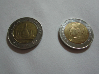タイの通貨単位は『B』バーツ。だいたい1B≒3円程度だ。 紙幣の種類は1000バーツ紙幣から、500、100、50、20 バーツまであり、デザインはどれもプミポン国王の肖像になっている。コインも広く流通 しており、旅中、紙幣の釣り銭で渡される為に、じゃらじゃらと財布に溜まっていく。 1B以下の補助通貨であるサタン(磁石の付く)も旅行中に勝手に増えていく。 |