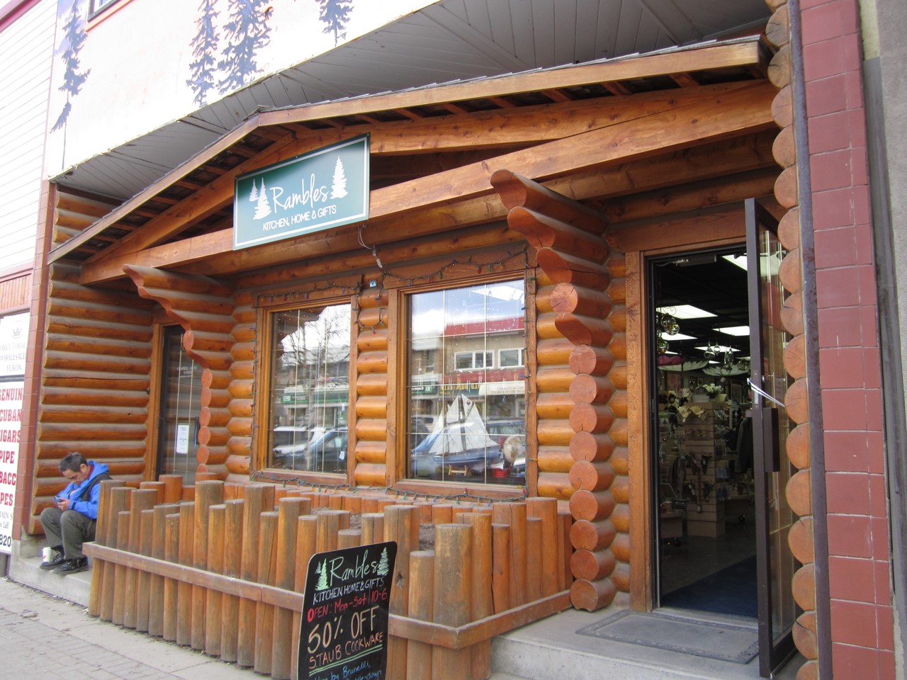 メインストリートをしばらく歩くと、確かに土産屋があった。 通りを挟んで各1軒づつ並ぶ。一般に云われる観光客用の汎用品のほか、 各種雑貨や日常品も扱っているようだ。 (PARADISE ALLEY):ユーコン準州特産の白樺シロップ、ファイヤーウィード(柳欄)、ジャム、鉱石、 ロジャーズチョコレート、トレーナーやプリントTシャツなどロゴ商品多数。 (RAMBLES):ホームキッチン用具や雑貨など。メイプルシロップも有る。 |
