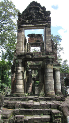 プリア・カンとは「聖なる剣」という意味だ。 敷地の構成は十字の構造で、東西南北に其々門を構える。1191年に 創建された祖寺方寺院である。 ジャヤヴァルマン七世の即位10年を記念し、父親の菩提を弔うために建てられた 経緯で、その用途は寺院というよりも、多数の職業や階級の人間が 集うテーマパーク的な意味合いがあった。 珍しい建物をあげれば、北側に ある2階建の開放性祠堂だろう。2階部に登ることは出来ないが、対側の土手から 全体像を眺めることはできる。この2階建石積建造物は プリア・カンにしかない建物なのだという。 |