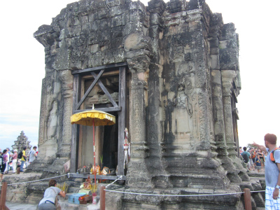 シェムリアップ地方に広がる平原は 東京23区くらいの広さで、遮る物の無い見渡す平原に、山や丘があればかなり目立つ。 古今東西、それは 山岳信仰の対象に成り得る存在であり、この地方では、 アンコール3聖山と数えられている。 プノン・クロム プノン・ボック そして3つ目が、このプノン・バケンだ。標高は60mあり、頂上に祠堂がある。 目下の平原は近代施設や道路など一切が無いので、360度パノラマ状で 深緑色のジャングルを見下ろせる。 景色は格別だ。 |