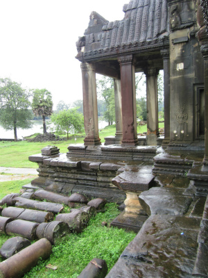宗教施設であると同時に、深い濠で囲まれたこの建造物は要塞としての 用途でも最高級の造りであった。時代巡って、70年代は クメール・ルージュが占拠しアジトとした経緯から、これら 内部の石仏や旧世代の構造物も一部破壊された。その後、79年にクメール・ルージュが ここから撤退すると、日本の遺跡の調査団が入り、現在まで少しつづであるが 修復を施して続けてきた。この 西参道部分の 修復は、現在、上智大学アンコール遺跡国際調査団によって施工されている。 『数年前には、ここをコンサート会場として使った事もあります』 「へー」 『不評をかって、以降は行われなくなりました』 |