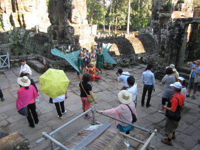 遺跡の 入口だけあり、観光客の多さは半端ではない。ワットの次に有名なアンコールトムの 中心部であり、また、大回りコースや小回りコースの 通過点でもあるので、バイヨン付近は時に車両渋滞も起すこともある。 |