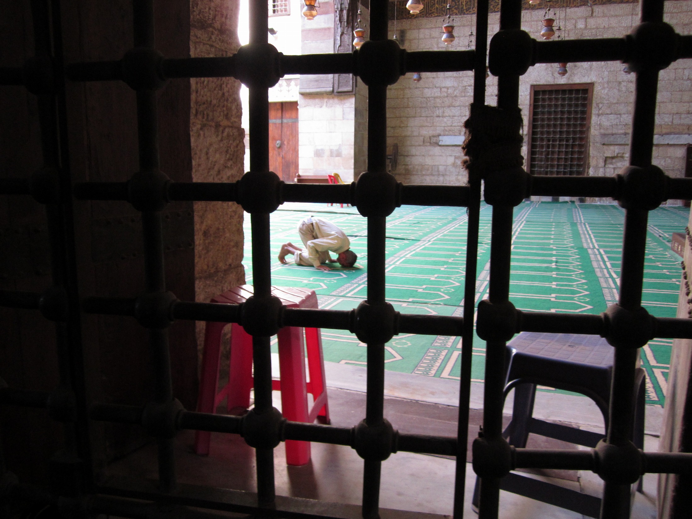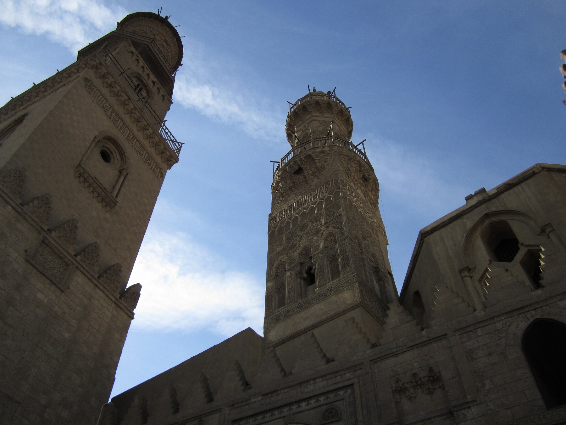 これは、靴を預かった、というサービスの行為に対して 支払われるべき対価であり、解釈としてはチップにあたる。また、これらの 建物はカイロの長い歴史の中、老朽や焼失などにより、その修復が望まれるべきである が、地区全体が世界遺産に登録されている にも関わらず、資金不足で理想的に進んでない一面もみせる。 少ないながらの寄進という形の運営であるので、ここは色を付けてあげたいところだ。 入場すると、場合によってはミナレットに登らせてくれることがある。 この入塔料金もまた修復や維持管理としての資金になるという事なのだろう。 ほぼ、どのモスクにも在る建造物で頂上の 眺望はとても良好であり、また、それぞれ形状、高度、本数など種々の違いがあり、 各塔各方向で違った景色を楽しめるのも面白い。 |