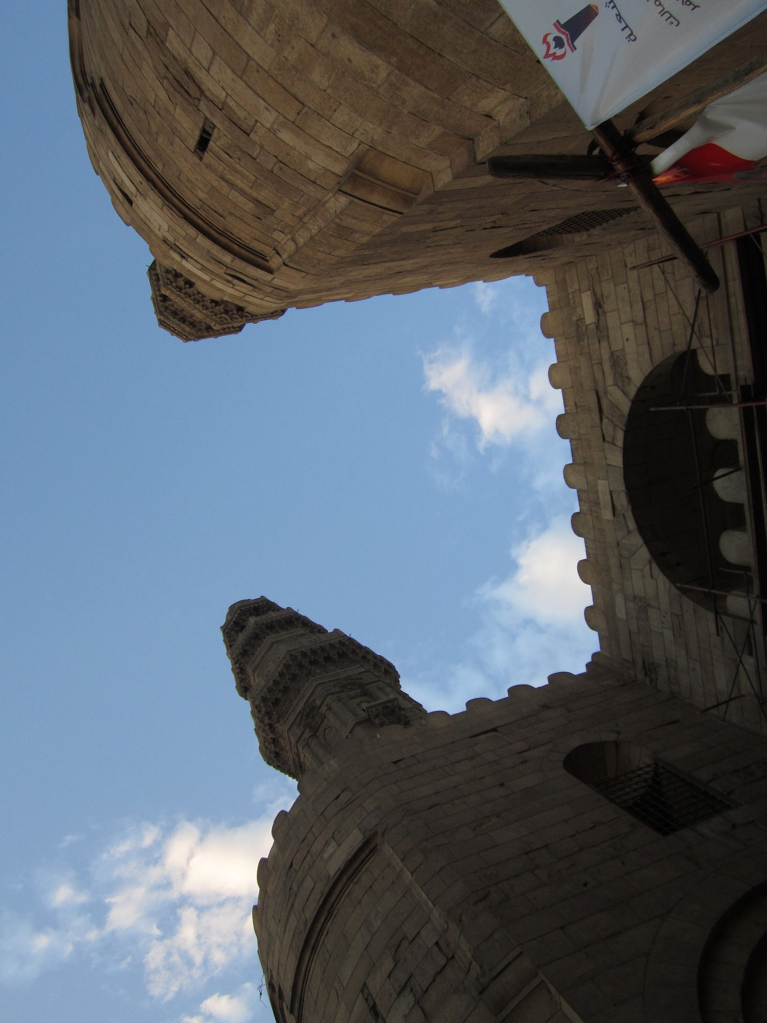 と隣接している為に、西洋人の観光客も多く見られる場所だ。 界隈は白い制服を着た 警官がおり治安の強化にあたっているが、夜間は居なくなる事もあるので、 その際はひったくり等の注意が必要になる。デモが勃発した 謂れか自動小銃を担ぎ物々しく、また一見厳つい風情だが、道を尋ねたり する分には、とても親切に教えてくれる有難い存在だった。門へ向かう 進行中も沢山の人々の往来があり、生き生きとした生活の局面を見ることができる。 処刑門ズウェーラ1092年の創建で、在りしのカイロにおいて囲まれた城壁都市の 南の入り口門、という位置付けであったようで、2本の立派なミナレットが聳え建つ堂々とした 佇まいだ。その昔は、斬首された罪人の首が並べられていたこともあったそうである。現在 は周囲にヌーク(市場)が多く軒を構えており、 たばこや雑貨、生活用品などを扱う、主に現地人の為の市として活気をみせている。 |