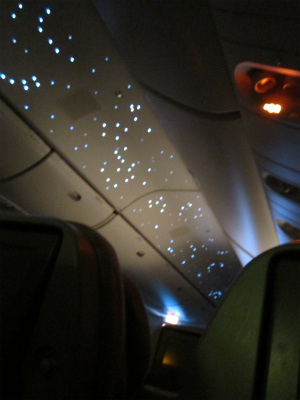 天井を見上げると、何やら星空が!どうやら青電球で人工の星空を描いているようだ。味な演出です。 暫くして窓下に目をやると本当の夜景、ドバイの灯が広がっていた。 やっとドバイ空港に到着したようだ。 |
