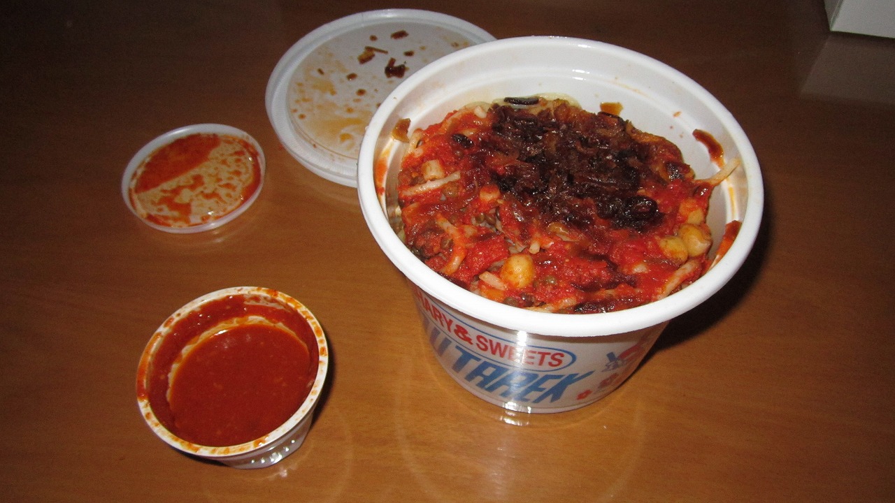 コシャリはエジプトを代表する名物の一つだ。 蓋を開けても一見では何のことやら どんな食物なのか解らないであろうが、ベースは最下層が米、 中層がブツ切りのマカロニとスパゲッティーであり、 上層は大豆や干し肉によってその構成をなしている。 酢とチリトマトの薬味により好みの味調節が出来るが、 チリトマトソースはとても辛い。とても辛い。 喉が渇くのでお水は必須、平気でペットボトル1本空けちゃいます。 辛いもの好きを自負する方であれば是非 挑戦して頂きたいその食べ方であり、また辛さを追求するのであれば 色々な店の物を試し食べ比べるのもいい。国民食だけあり コシャリだけでも多くの店が存在し、それぞれに微妙に 味付けや構成が異なってくるのも面白い。 |