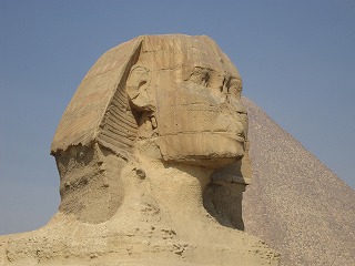 獣人王頭は人間、身体はライオン、と一見怪物を連想させるスフィンクスであるが、 古代エジプトでは頭部と身体の各々が、ファラオ王と百獣の王の擬似化であり、 更にそれらを併せた力の権化、威厳の象徴という意味合いでもあった。 全長57m、高径20m、一枚岩から彫った巨像としては世界最大の造形物 になる。全体的なバランスで云うと、前足から長い胴体、そして後足から尾に至るまでの堂々 たる体躯であるのに比べ、頭部はやや小さい。これは、紀元前2500の当時 絶大なる権力を掌握していたカフラー王がその頭を 自分に似せた顔に挿げ替えたためだ、との説がある。この仮説に依れば同時に、スフィンクスが 古王国時代よりも昔に存在していたモニュメントである、との方程式も成り立つわけだ。 |
