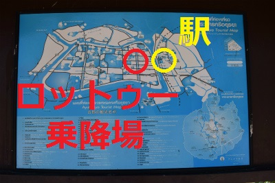 ちなみに、帰りは大混雑。全席埋まって、運転手含め15名で出発した。 運賃は行きと同じく60Bで、ワゴンの扉の前で現金を払って乗車 する、のみ。チケットの発行は無かった(^_^;) でも、 スピードは ゆっくりめの安全運転 。乗客は、海外からの観光客の方が多く、疲れていたのか皆んな寝ていた。 トゥクトゥクを雇うさて、ロットゥーはアユタヤで停車し、 2人の乗客も降りていった。私もそれに続いて降車し、初めて来るアユタヤ県の辺りを見回してみた。 雰囲気からしてもメインストリートであるに違いない。 恐らく某ガイド本に解説してあった通りに、『アユタヤ駅』を挟んだ川を渡りきった中央付近の位置まで 来ているのだろう。通常、電車で来る場合は、駅からバーサック川を渡し舟で 渡る事になる、とご丁寧に解説してあったので、ミニバス「ロットゥー」が遺跡の近くまで運んでくれたのは 有難い話だった。 |