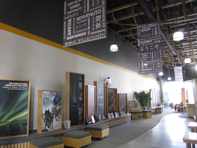 そのまま、しばらく通りを沿ってみると ユーコン・ビジターセンターが建っていた。入場すると大きなホールがあり、 掲げられたwelcome横断幕に、ひときわ大きな日本語表記「ようこそ」とも書かれて ある。当地を訪れる邦人の多さを証明している。 受付兼案内人の職員が、英語で旅行者にホワイトホース観光について説明していた。小生、 ここは粋にアメリカナイズされた挨拶で親睦を深めようかな、とやや大げさなジェスチャーを 交えてオッサン職員に話掛ける。 「どうだい景気は?親爺っさん」 『what?』 「ああ・・・はわわ、どうも。いやぁ〜オーロラって凄いっすねえ」 『what(お前、何言ってんだよ)?』 「ああ・・・あの、トイレ貸してください」 『廊下を出て突き当りだ』 「あ・・・、どうも」 |