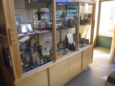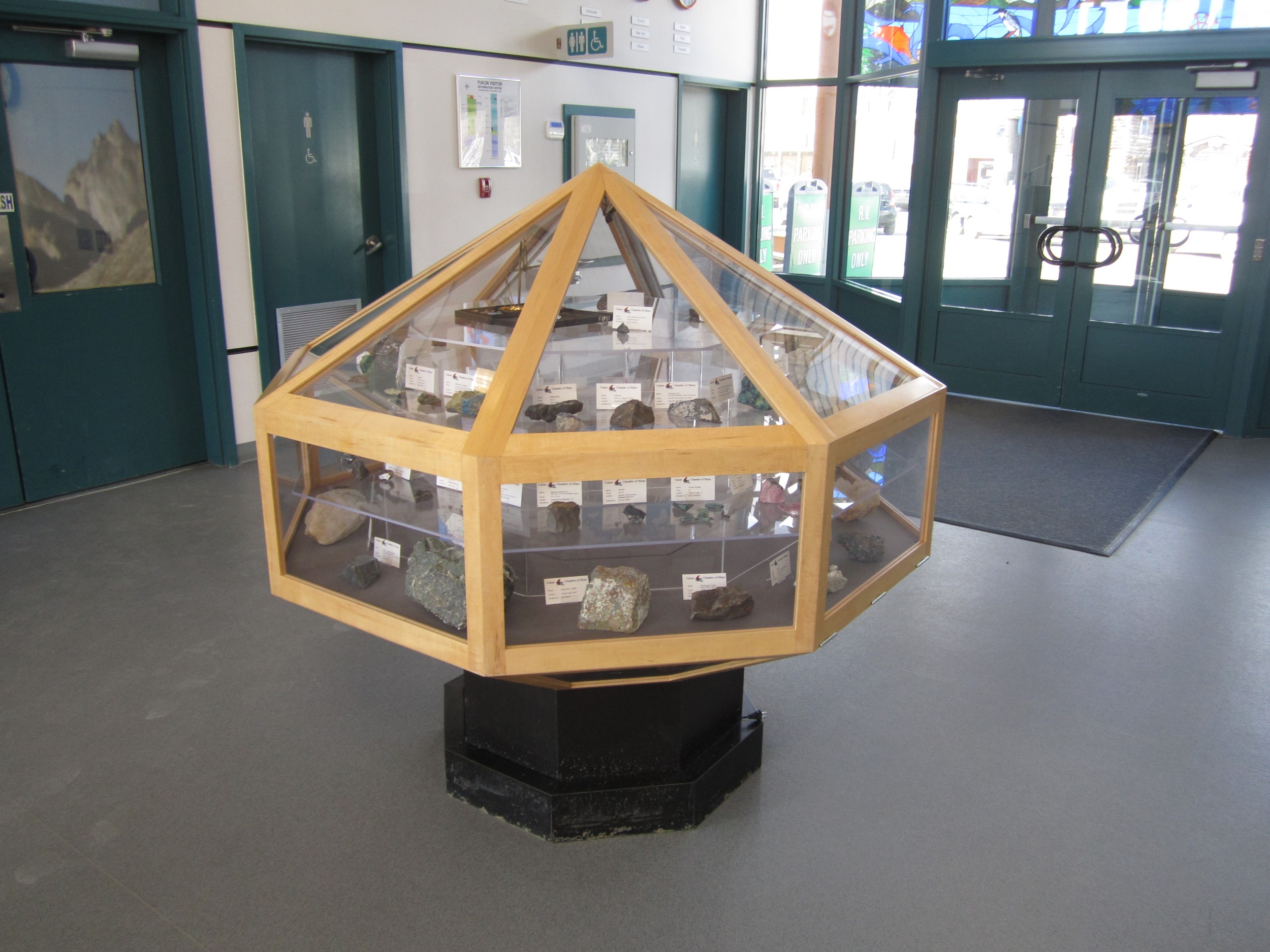 トイレを出ると、木製の鑑賞棚に鉱石が並べられてある。 緑色など明らかにエメラルド系と判るものもあるが、ほとんどは原石のまま陳列され その分野に詳しくないと何の石なのかわからない。この地方の発展が、鉱物を求めた 人々によって成された事実を、これらの陳列物が物語っていた。 |