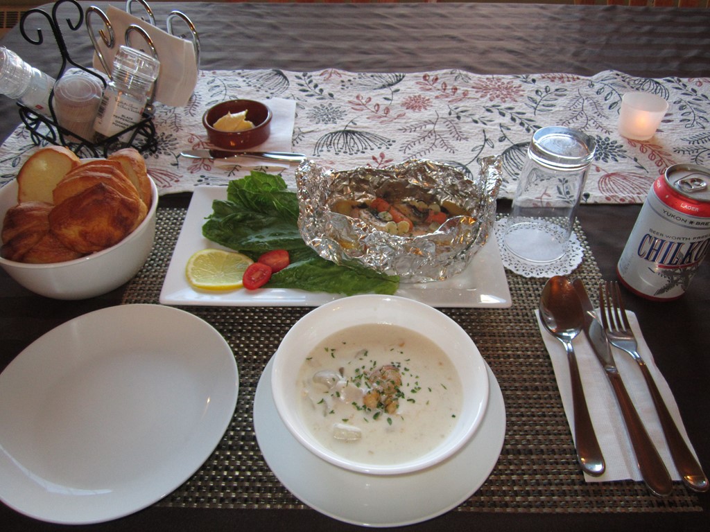 ロッジに帰ると、夕食を用意してくれていた。 本日は、クラムチャウダーと洋パン、メインはカナダらしくサーモンのボイル焼きだ。 デザートにアイスクリームも添えられている。 地ビールも購入可能。地ビールの味は淡泊で炭酸水を飲んでいるような感じだった。 ビール片手にほろ酔い気分で夜を待つ。オーロラ出現を願って・・・ |