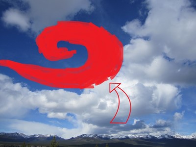 オーロラの発色は、帯電した太陽風が地球表面を覆う大気中の原子に衝突する 時に決まる。この際、酸素と衝突する 場合は赤や緑で発光し、窒素と衝突する場合は青やピンクに発光する。さらに、荷電した粒子の エネルギーの度合いでも色彩が変化してくる。つまり、エネルギーが高くなるにつれ、緑から 青、さらにピンク色になる。 第3波が来た時間は24:30を少し回った頃だった。 この時のオーロラは、本体の下端部がピンク色に染まっていた。 高エネルギーを帯びた個体であるのは 一目瞭然だった。 そして、これがカナダ渡航後に 初めてハッキリと肉眼でオーロラを捉えた瞬間でもあった。もう この瞬間に狂喜狂乱。 さらに、ただ激しく光るだけでなく、南寄りに位置していた私の すぐ近くまで高速で移動して、頭上でウネウネと活発に動き出したのだ。 予備知識がなければ、恐怖を憶えるレベルだ。 下記の2枚画像のうち、左は普段のオーロラが停滞していた位置。いつもは山稜頂に掛かり 発色も薄く筋紋様程度の控めな状態だったが、今回 の第3波を模した図が右になるのだが、対比すると大きさは桁違いである。 |