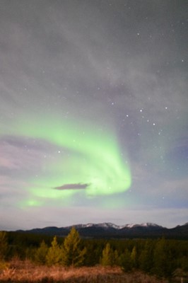 今回の二重オーロラは、多重型か、もしくは渦状型の亜種オーロラだろう。 シャッターを切るたびに、造形が変わってしまうくらいに動きが活発だ。そして、 頭上で一通り暴れ回ったあと一瞬で、そう「一瞬」にして本体が消えた。 |