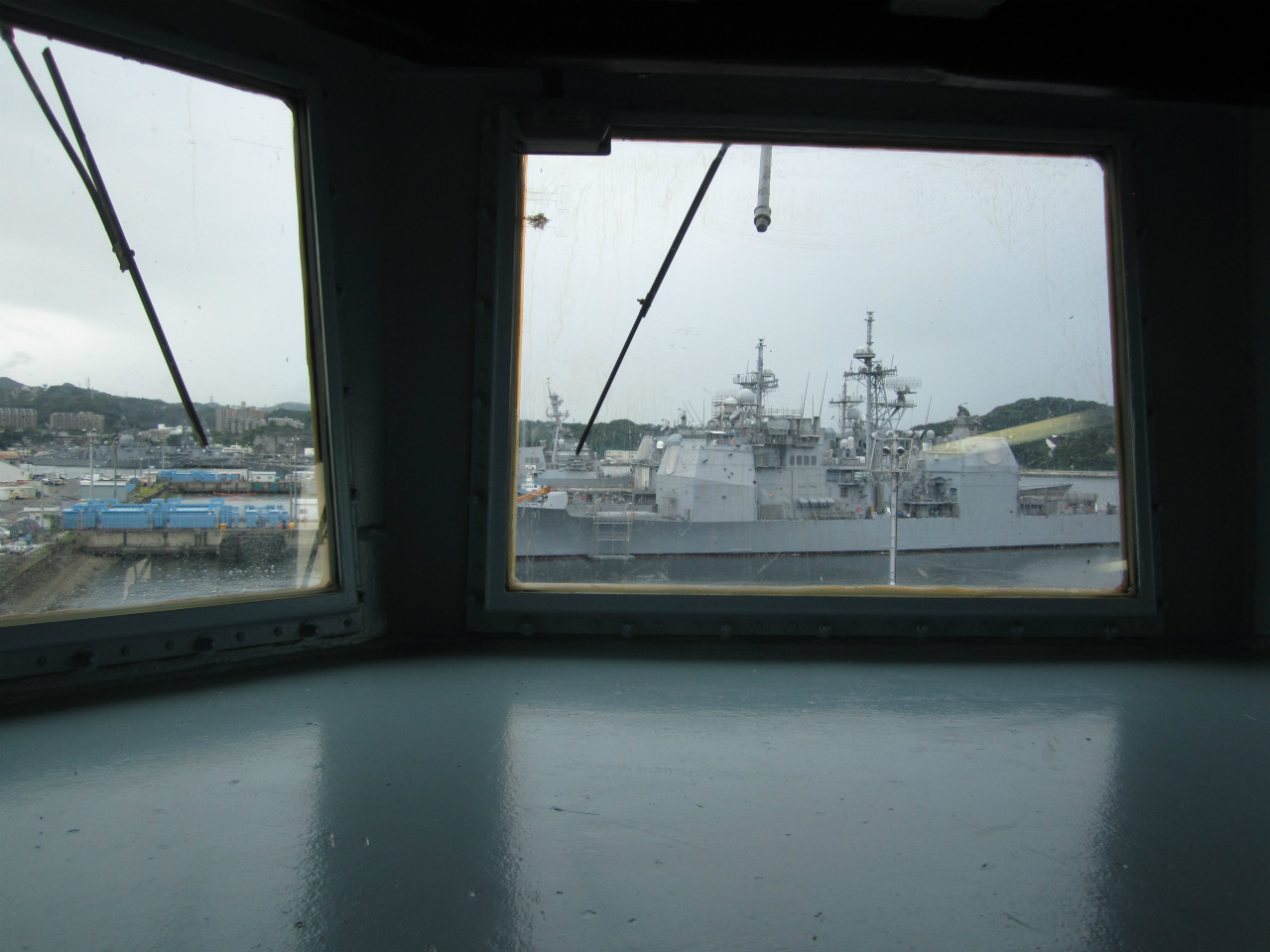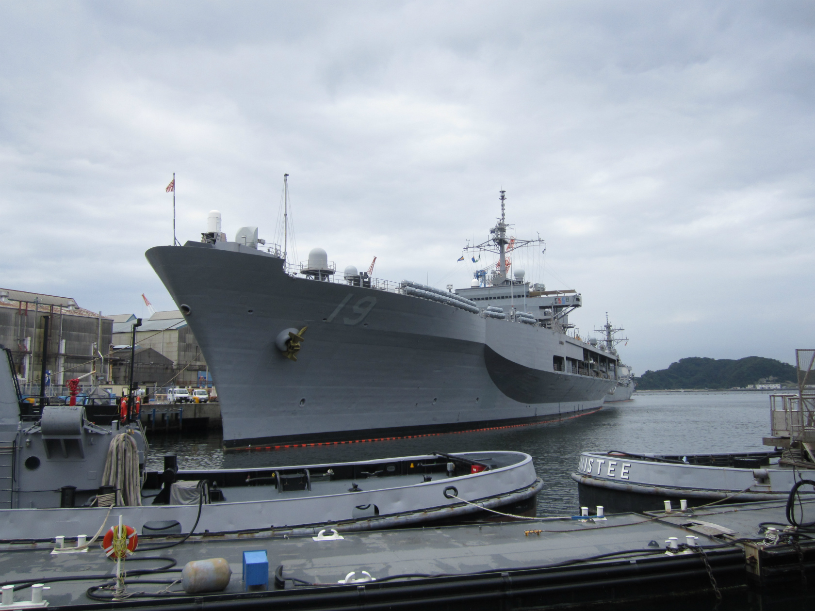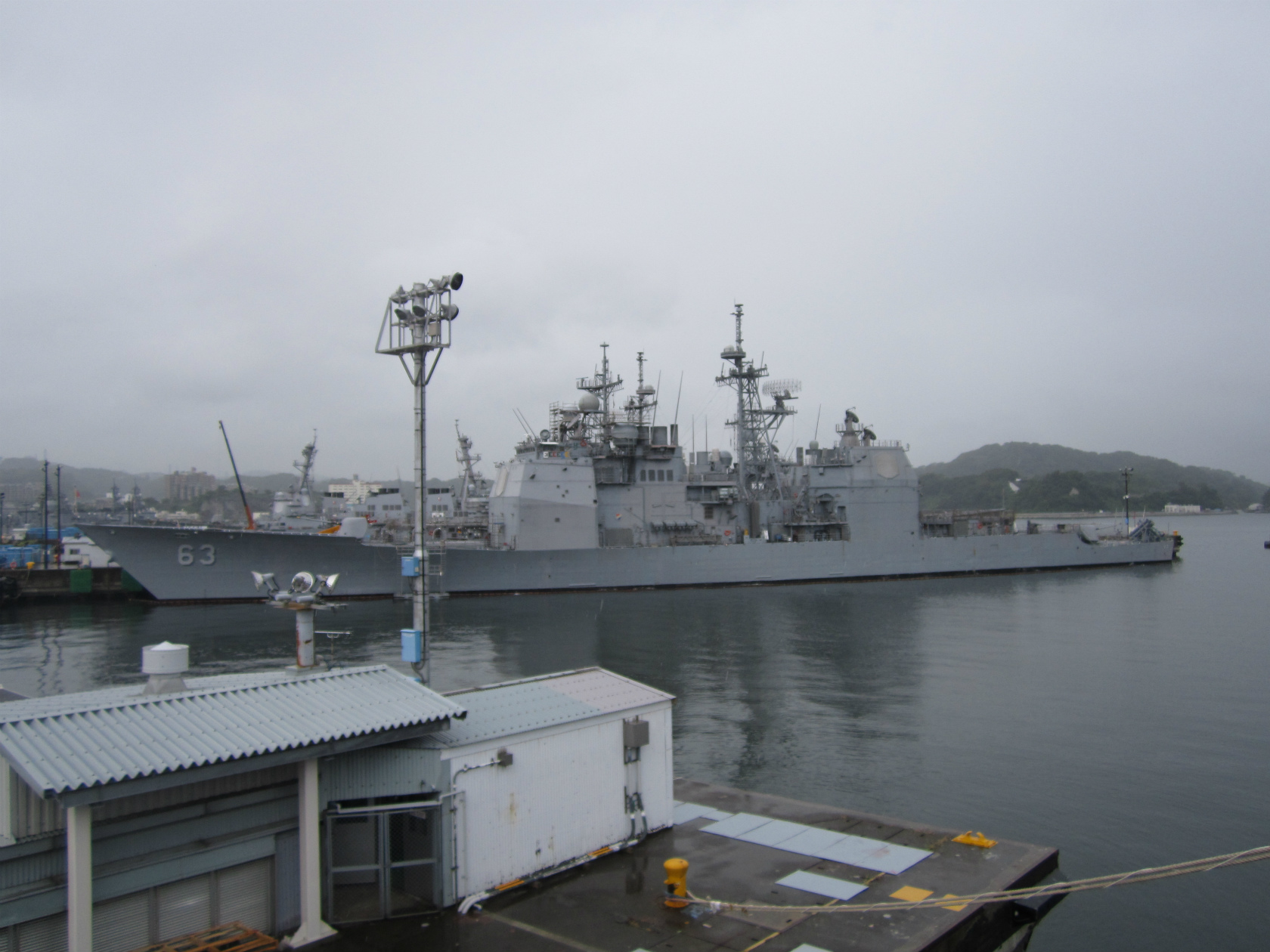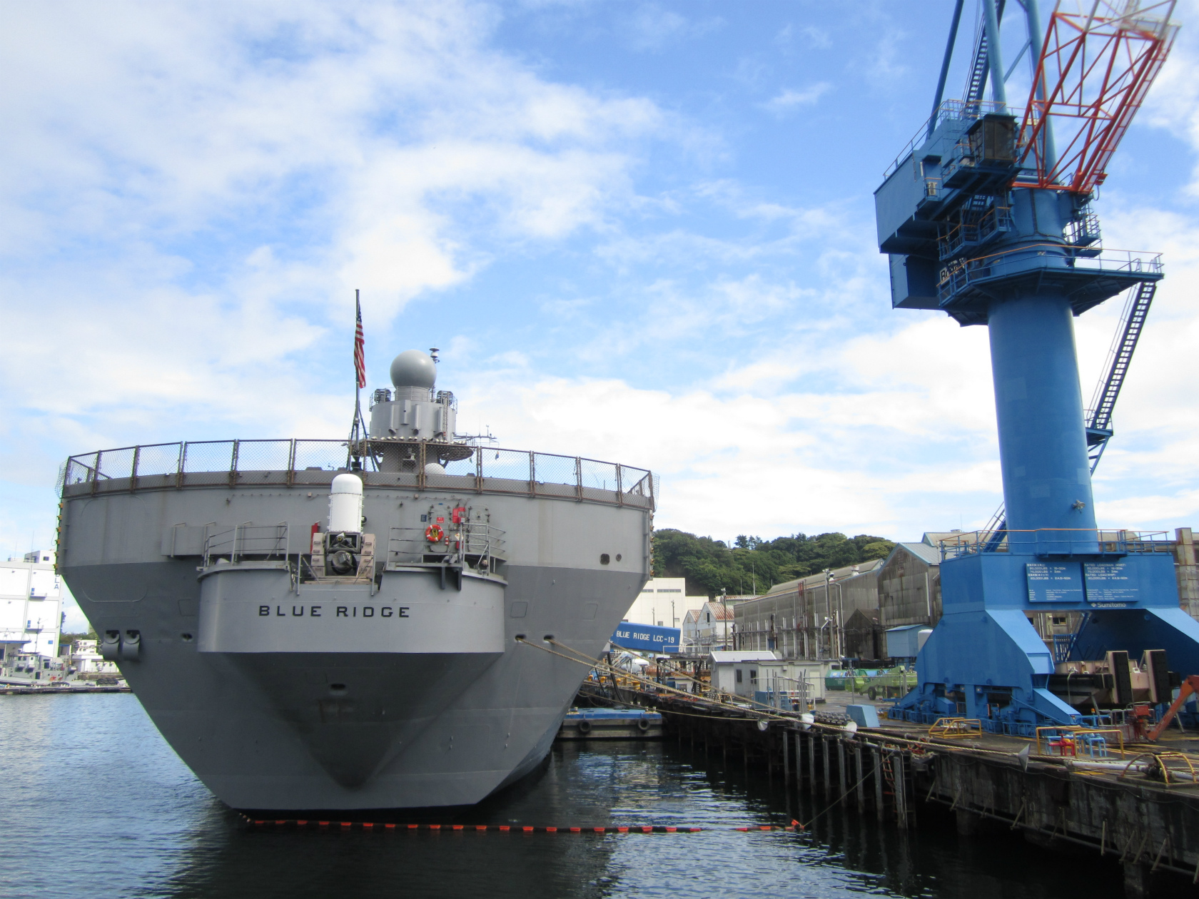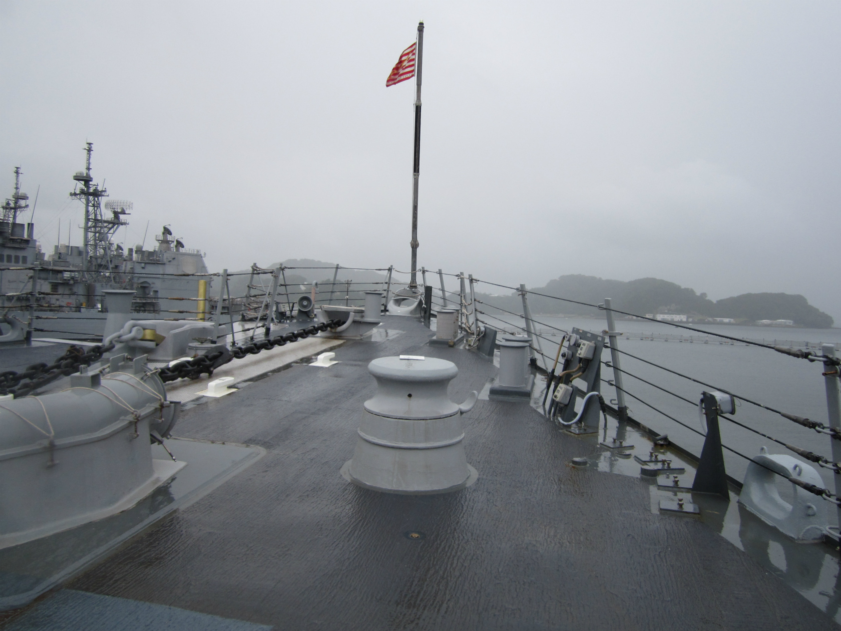基地の西側は入り江の湾になっており現役軍艦が何隻も停泊しています。 開放日の最大のイベントは、艦船の内部見学になるでしょう。手前BERTH8エリアは 「BLUE RIDGE」が、奥のBERTH9エリアに「FITZGERALD」が停泊しており、本年度は「FITZGERALD」 (フィッツジェラルド号)の乗船が可能になっていました。 |
