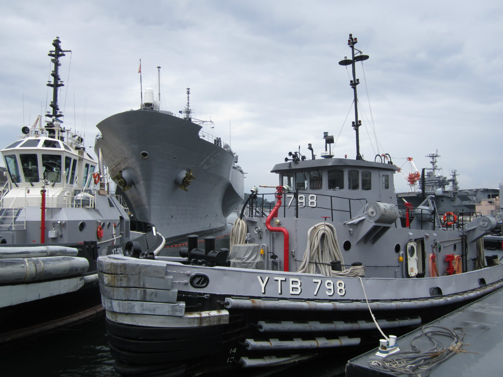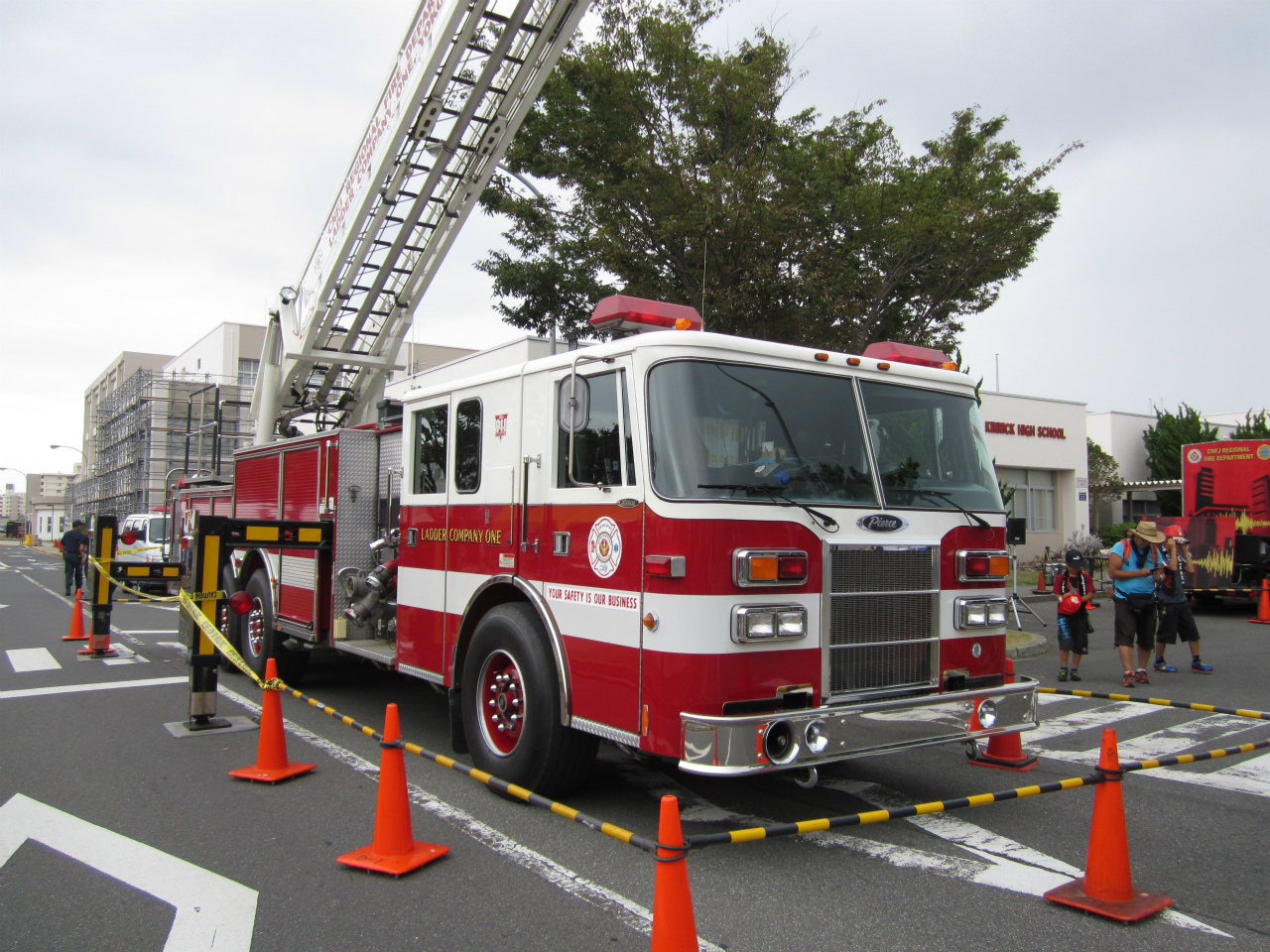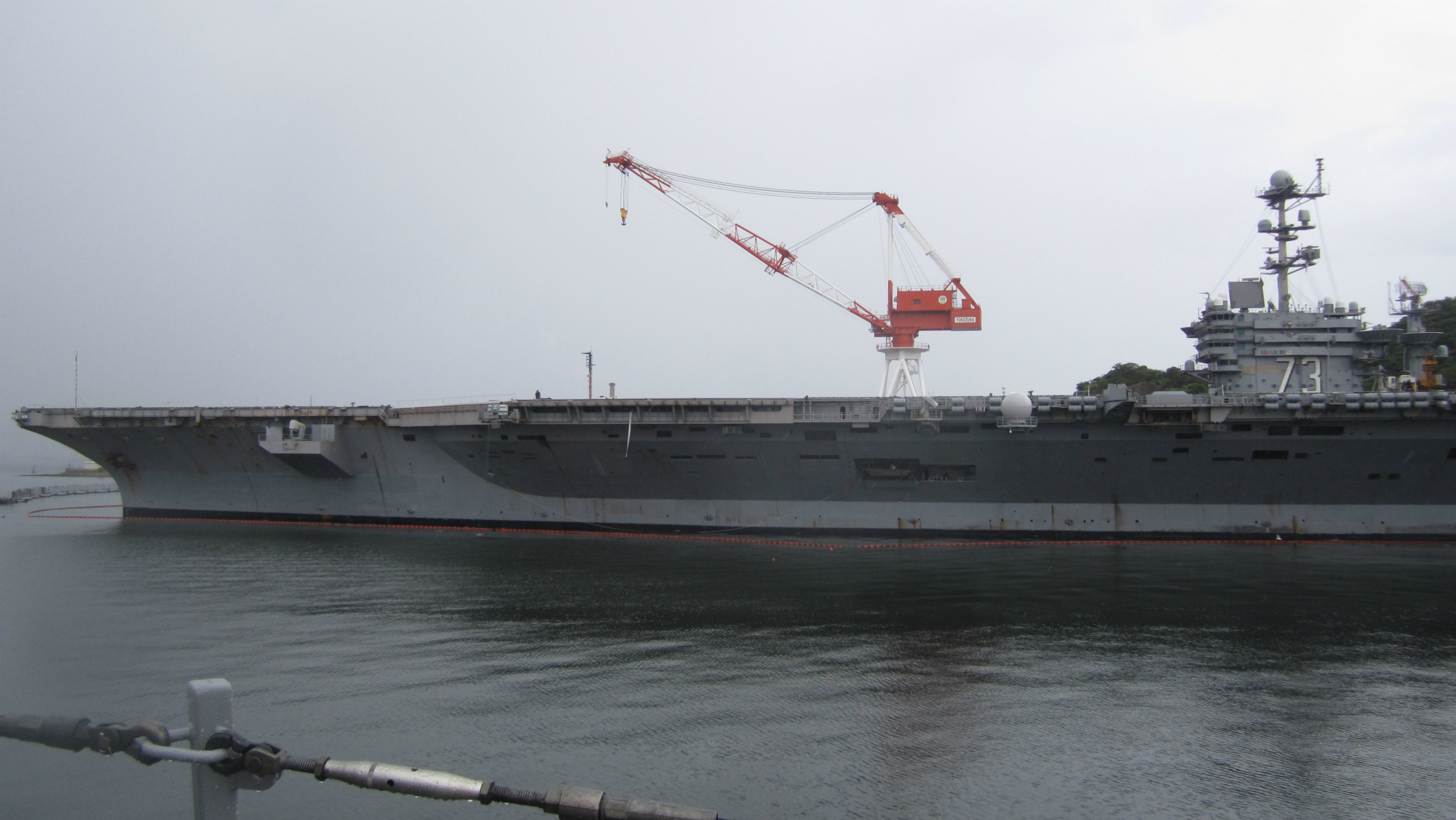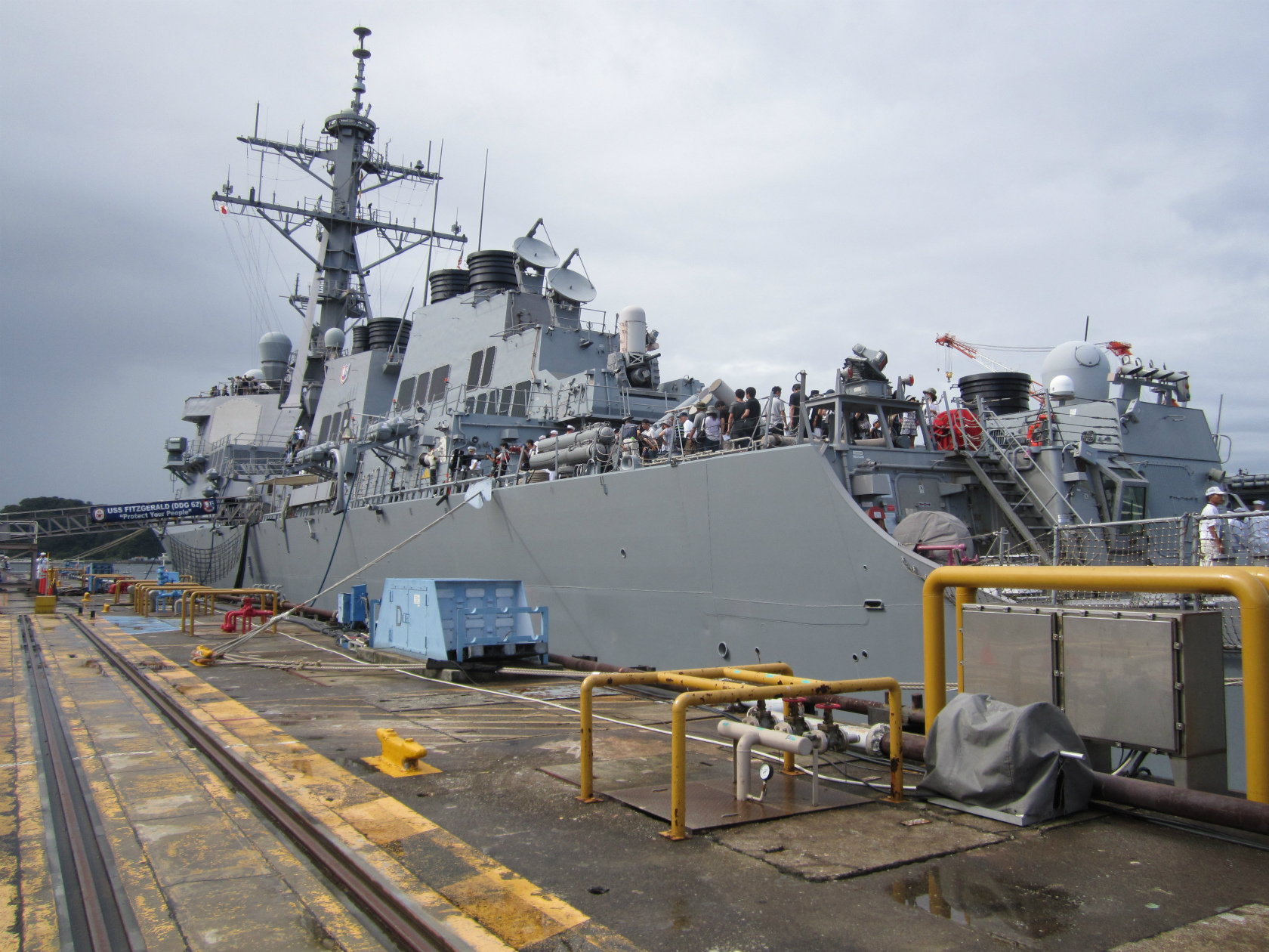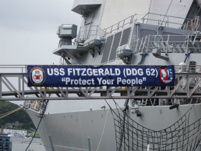 基地の西側は入り江の湾になっており現役軍艦が何隻も停泊しています。 開放日の最大のイベントは、艦船の内部見学になるでしょう。手前BERTH8エリアは 「BLUE RIDGE」が、奥のBERTH9エリアに「FITZGERALD」が停泊しており、本年度は「FITZGERALD」 (フィッツジェラルド号)の乗船が可能になっていました。 |