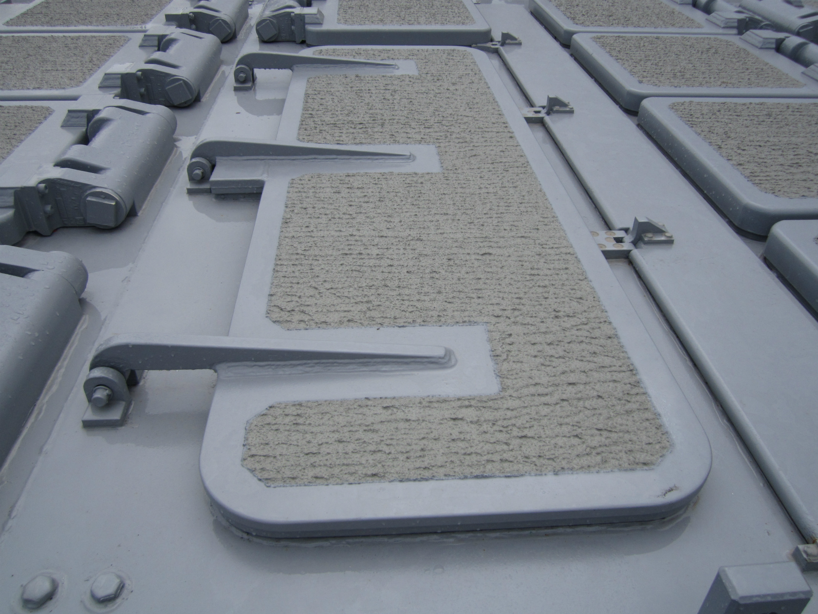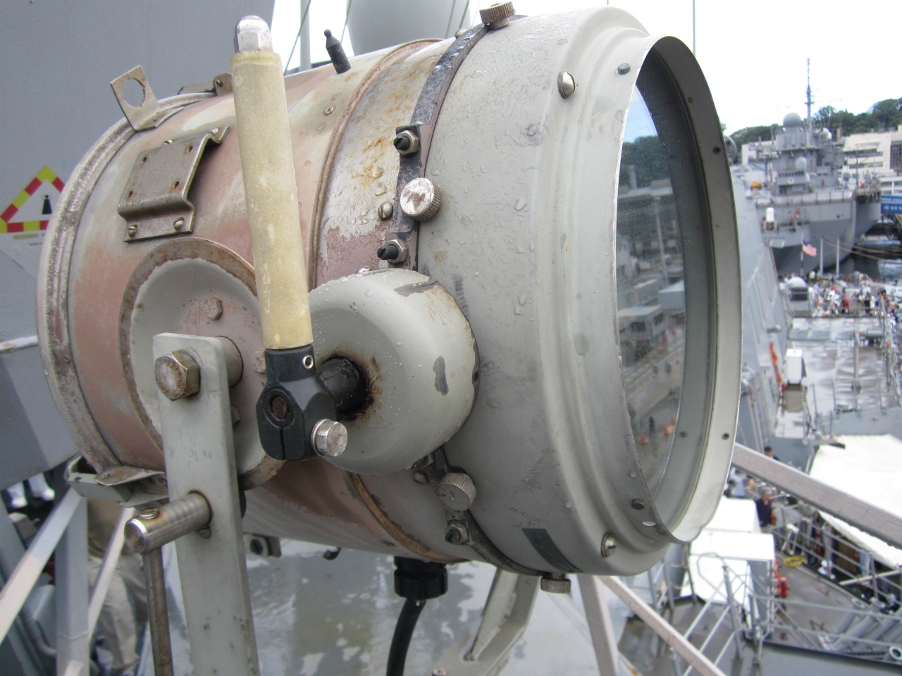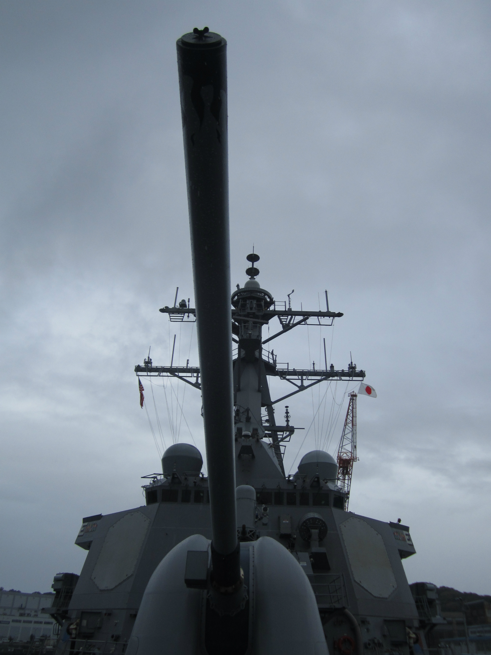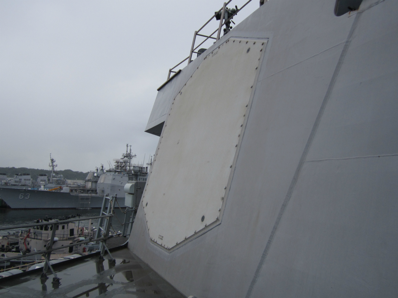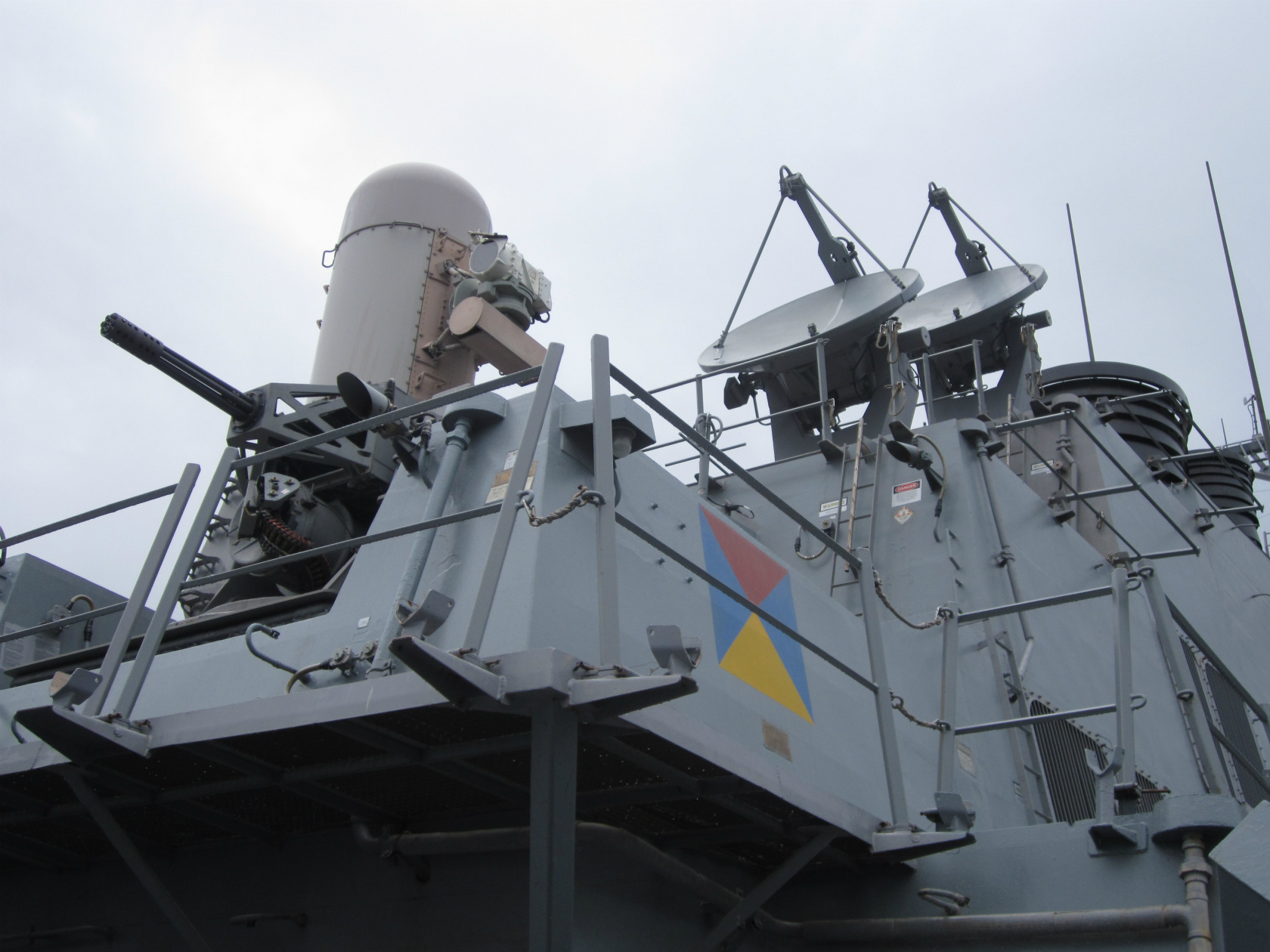 右舷と左舷にある八角形のパネルはSPYレーダーといい、 160キロメートル範囲の索敵が可能です。世界最先端の海軍レーダーです。 白いドーム型のシステムはCIWSといい、本船を標的としたミサイルを 打ち落とすために装備され、邦名は近接防御火器システムとのことです。 20ミリ砲を1分間に3000回発射が可能です。 |