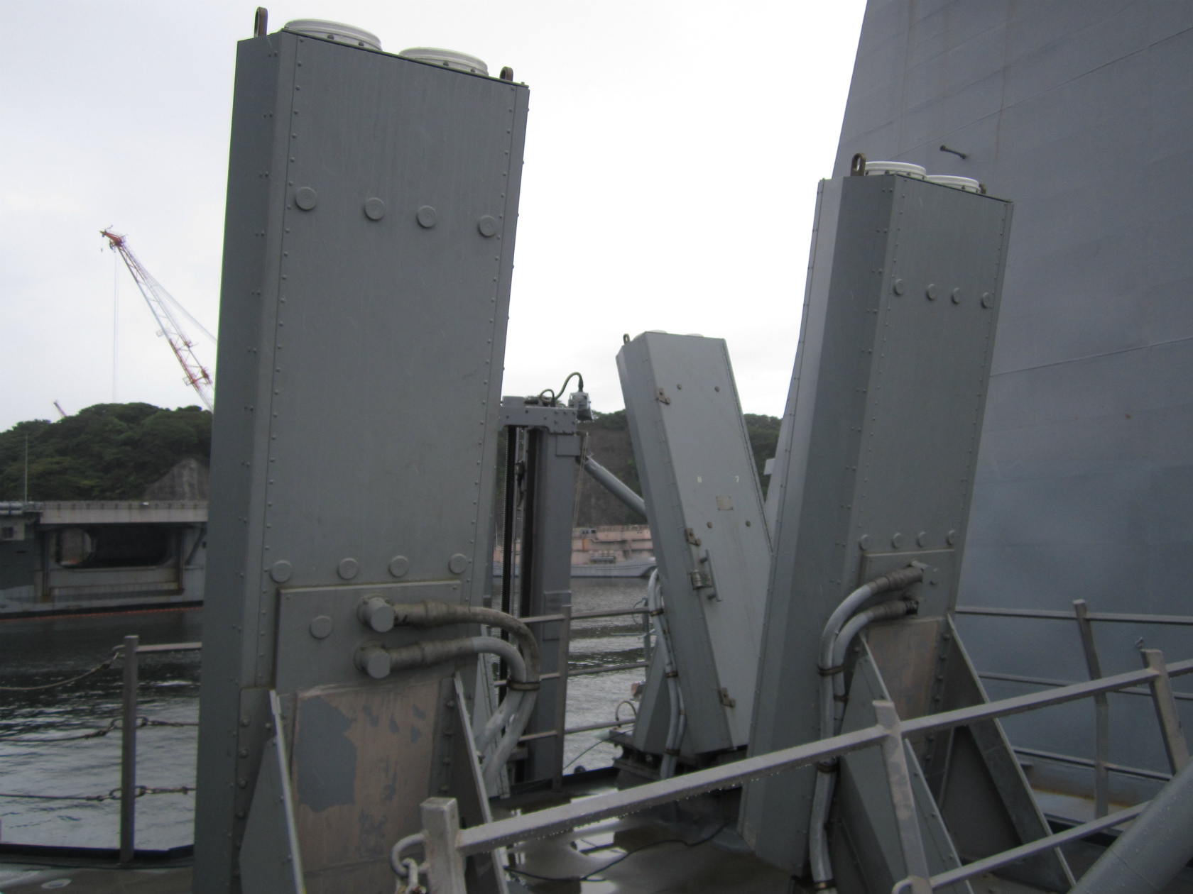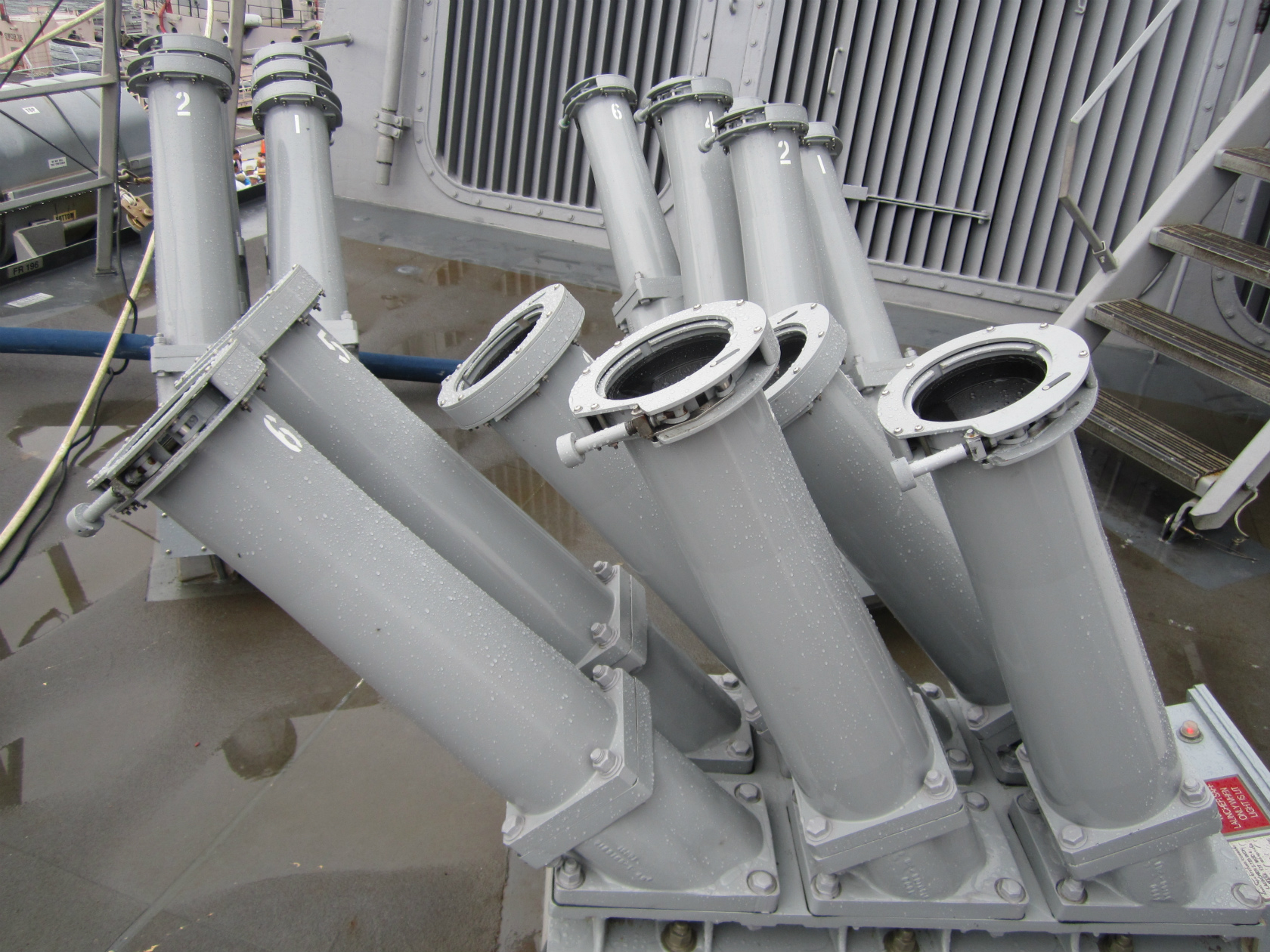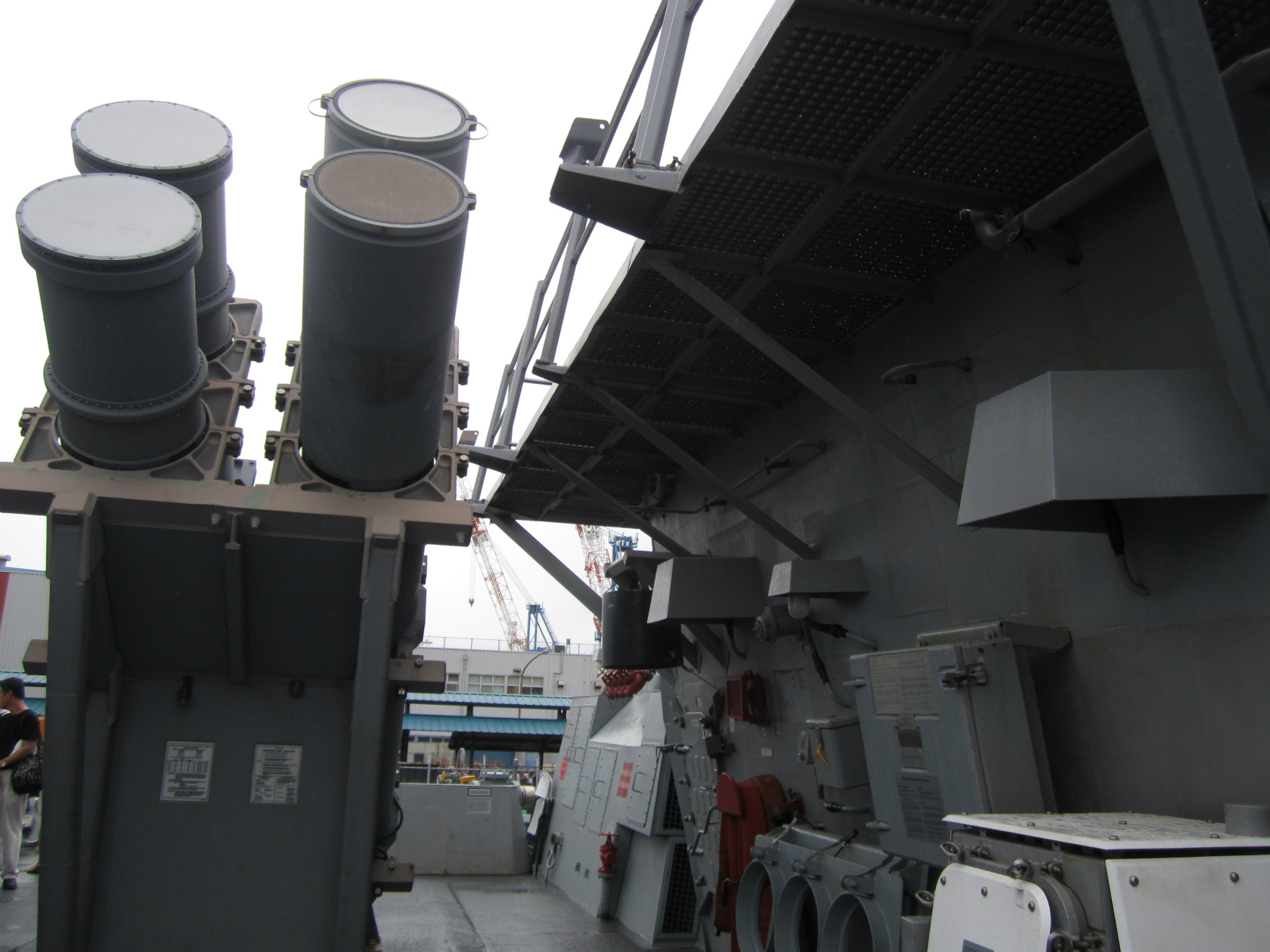 大小様々にミサイル発射筒がありますが、船尾の4×2の計8本、 ひときわ大型のモノがハープーンミサイル発射筒になります。 |