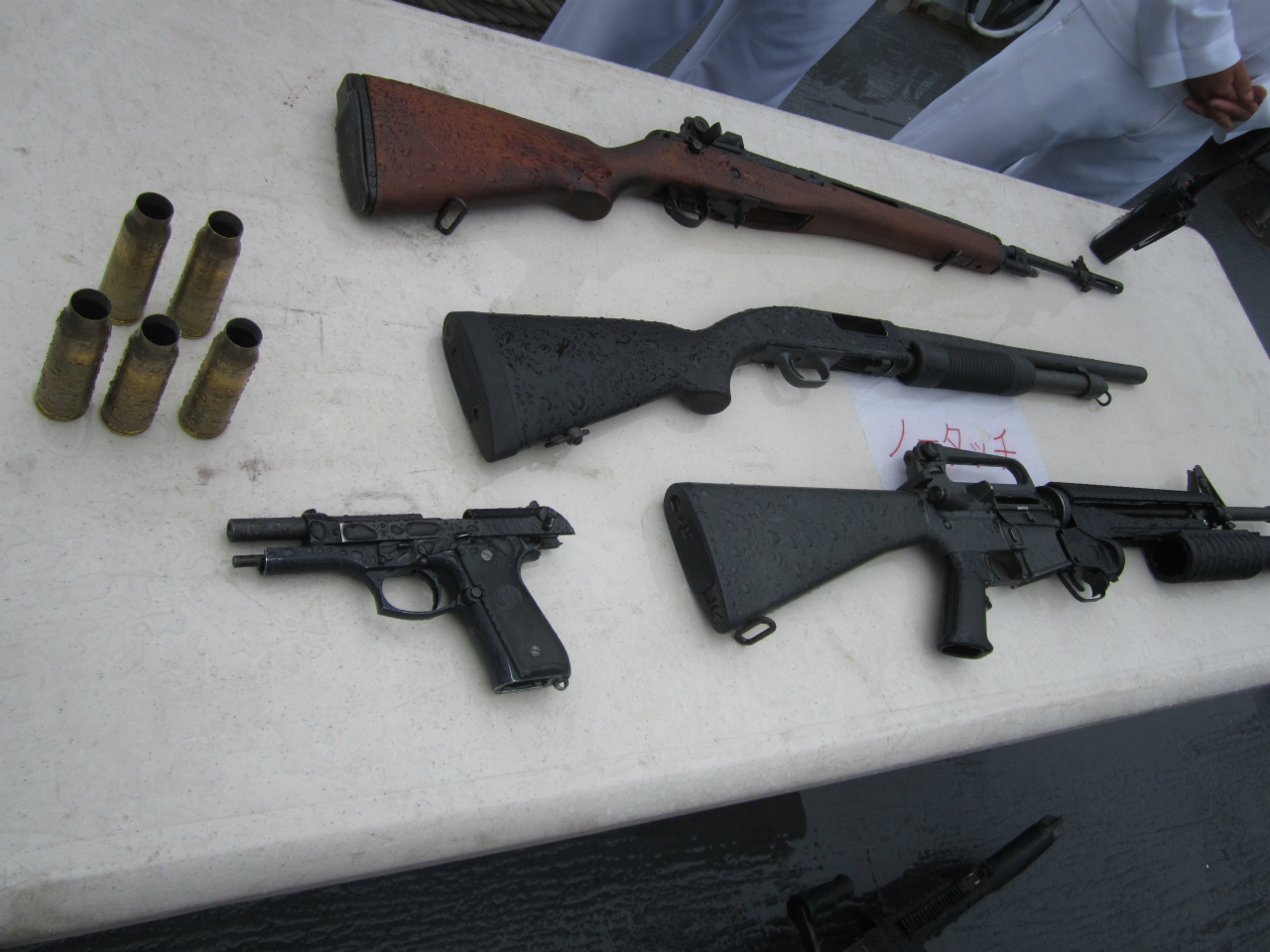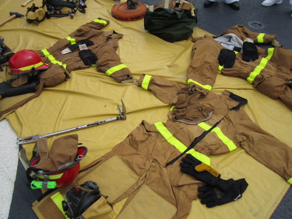 船尾エリアでは、救命具を実際に担いで重さの体感できる余興や、実銃を目の前で 見せてくれたりと、 写真撮影の他にも中々サービスが良いようです。 |